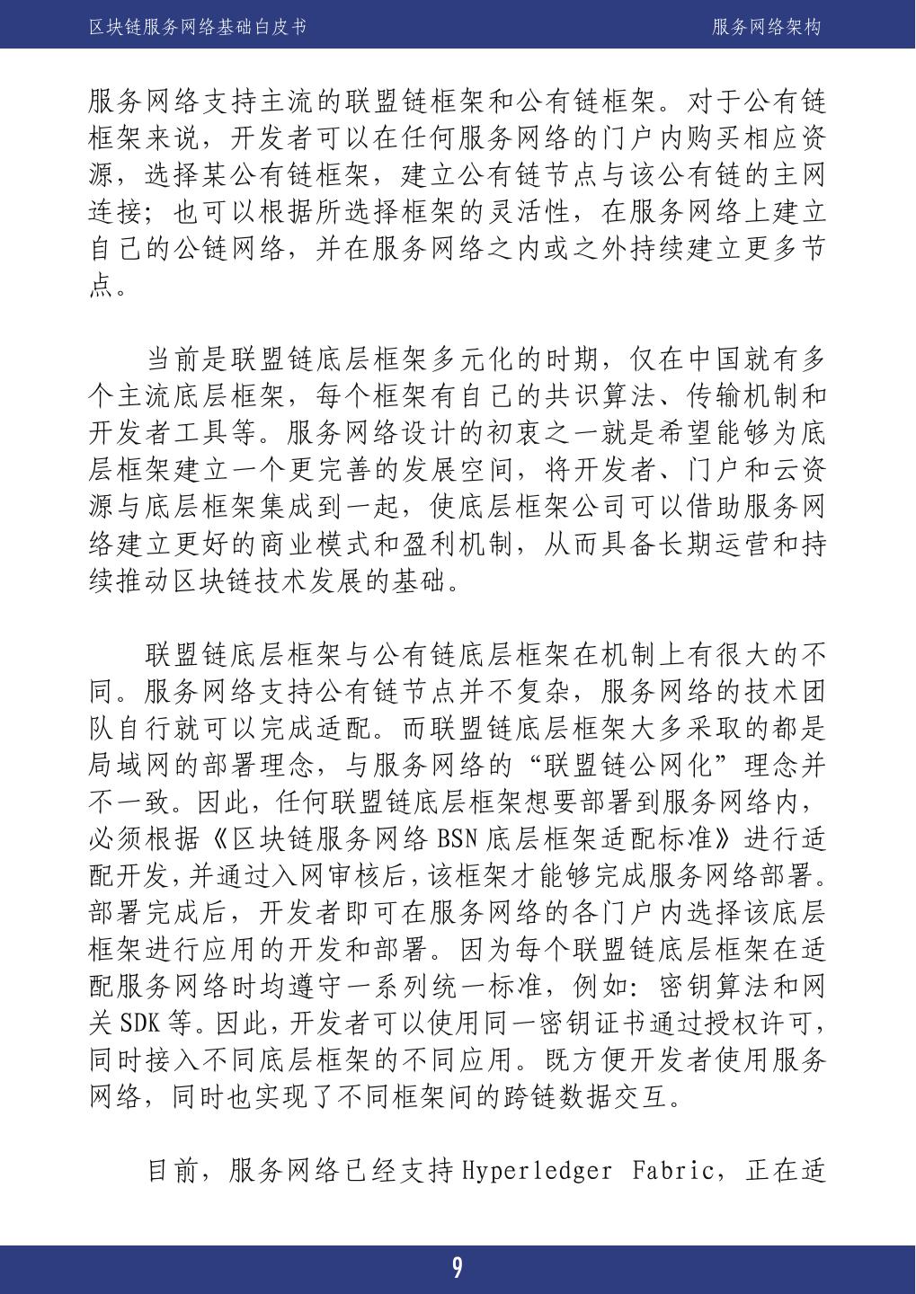 13 .区块链服务网络基础白皮书 服务网络架构 服务网络支持主流的联盟链框架和公有链框架。对于公有链 框架来说,开发者可以在任何服务网络的门户内购买相应资 源,选择某公有链框架,建立公有链节点与该公有链的主网 连接;也可以根据所选择框架的灵活性,在服务网络上建立 自己的公链网络,并在服务网络之内或之外持续建立更多节 点。 服务当前是联盟链底层框架多元化的时期,仅在中国就有多 个主流底层框架,每个框架有自己的共识算法、传输机制和 开发者工具等。服务网络设计的初衷之一就是希望能够为底 层框架建立一个更完善的发展空间,将开发者、门户和云资 源与底层框架集成到一起,使底层框架公司可以借助服务网 络建立更好的商业模式和盈利机制,从而具备长期运营和持 续推动区块链技术发展的基础。 服务联盟链底层框架与公有链底层框架在机制上有很大的不 同。服务网络支持公有链节点并不复杂,服务网络的技术团 队自行就可以完成适配。而联盟链底层框架大多采取的都是 局域网的部署理念,与服务网络的“联盟链公网化”理念并 不一致。因此,任何联盟链底层框架想要部署到服务网络内, 必须根据《区块链服务网络 BSN 底层框架适配标准》进行适 配开发,并通过入网审核后,该框架才能够完成服务网络部署。 部署完成后,开发者即可在服务网络的各门户内选择该底层 框架进行应用的开发和部署。因为每个联盟链底层框架在适 配服务网络时均遵守一系列统一标准,例如:密钥算法和网 关 SDK 等。因此,开发者可以使用同一密钥证书通过授权许可, 同时接入不同底层框架的不同应用。既方便开发者使用服务 网络,同时也实现了不同框架间的跨链数据交互。 服务目前,服务网络已经支持 Hyperledger Fabric,正在适 9