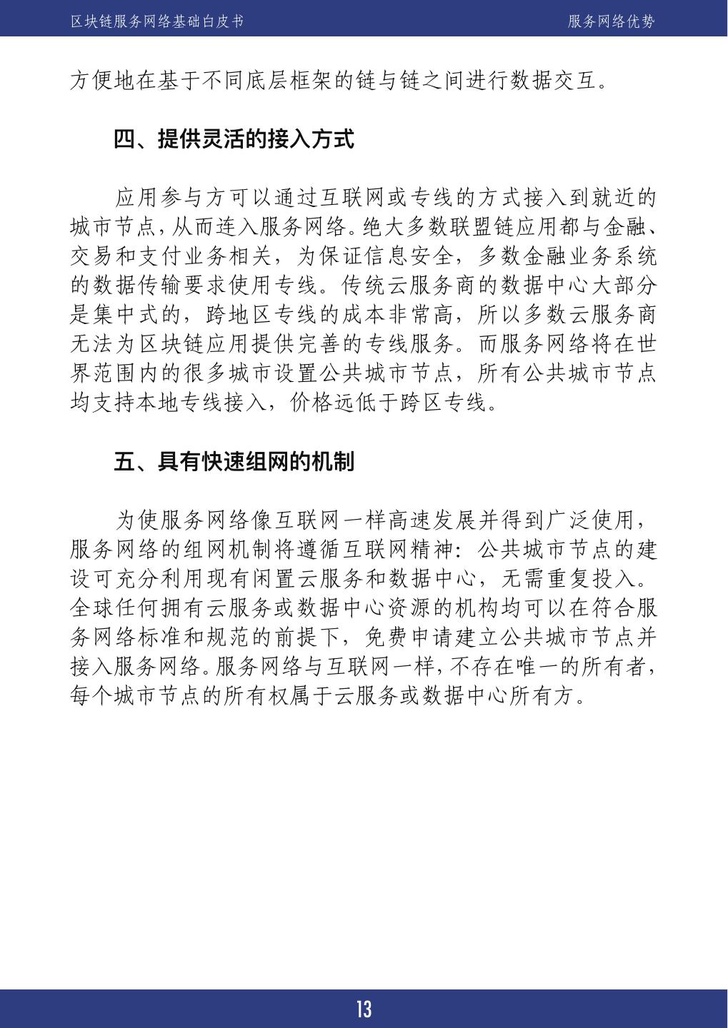 17 .区块链服务网络基础白皮书 服务网络优势 方便地在基于不同底层框架的链与链之间进行数据交互。 服务四、提供灵活的接入方式 服务应用参与方可以通过互联网或专线的方式接入到就近的 城市节点,从而连入服务网络。绝大多数联盟链应用都与金融、 交易和支付业务相关,为保证信息安全,多数金融业务系统 的数据传输要求使用专线。传统云服务商的数据中心大部分 是集中式的,跨地区专线的成本非常高,所以多数云服务商 无法为区块链应用提供完善的专线服务。而服务网络将在世 界范围内的很多城市设置公共城市节点,所有公共城市节点 均支持本地专线接入,价格远低于跨区专线。 服务五、具有快速组网的机制 服务为使服务网络像互联网一样高速发展并得到广泛使用, 服务网络的组网机制将遵循互联网精神:公共城市节点的建 设可充分利用现有闲置云服务和数据中心,无需重复投入。 全球任何拥有云服务或数据中心资源的机构均可以在符合服 务网络标准和规范的前提下,免费申请建立公共城市节点并 接入服务网络。服务网络与互联网一样,不存在唯一的所有者, 每个城市节点的所有权属于云服务或数据中心所有方。 13