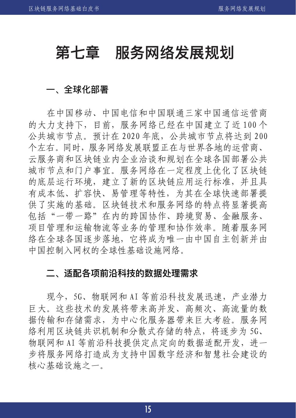 19 .区块链服务网络基础白皮书 服务网络发展规划 第七章 服务网络发展规划 服务一、全球化部署 服务在中国移动、中国电信和中国联通三家中国通信运营商 的大力支持下,目前,服务网络已经在中国建立了近 100 个 公共城市节点。预计在 2020 年底,公共城市节点将达到 200 个左右。同时,服务网络发展联盟正在与世界各地的运营商、 云服务商和区块链业内企业洽谈和规划在全球各国部署公共 城市节点和门户事宜。服务网络在一定程度上优化了区块链 的底层运行环境,建立了新的区块链应用运行标准,并且具 有成本低、扩容快、易管理等特性,为其在全球快速部署提 供了实施的基础。区块链技术和服务网络的特点将显著提高 包括“一带一路”在内的跨国协作、跨境贸易、金融服务、 项目管理和运输物流等业务的管理和协作效率。随着服务网 络在全球各国逐步落地,它将成为唯一由中国自主创新并由 中国控制入网权的全球性基础设施网络。 服务二、适配各项前沿科技的数据处理需求 服务现今,5G、物联网和 AI 等前沿科技发展迅速,产业潜力 巨大。这些技术的发展将带来高并发、高频次、高流量的数 据传输和存储需求,为中心化服务器带来巨大考验。服务网 络利用区块链共识机制和分散式存储的特点,将逐步为 5G、 物联网和 AI 等前沿科技提供定点定向的数据适配开发,进一 步将服务网络打造成为支持中国数字经济和智慧社会建设的 核心基础设施之一。 15