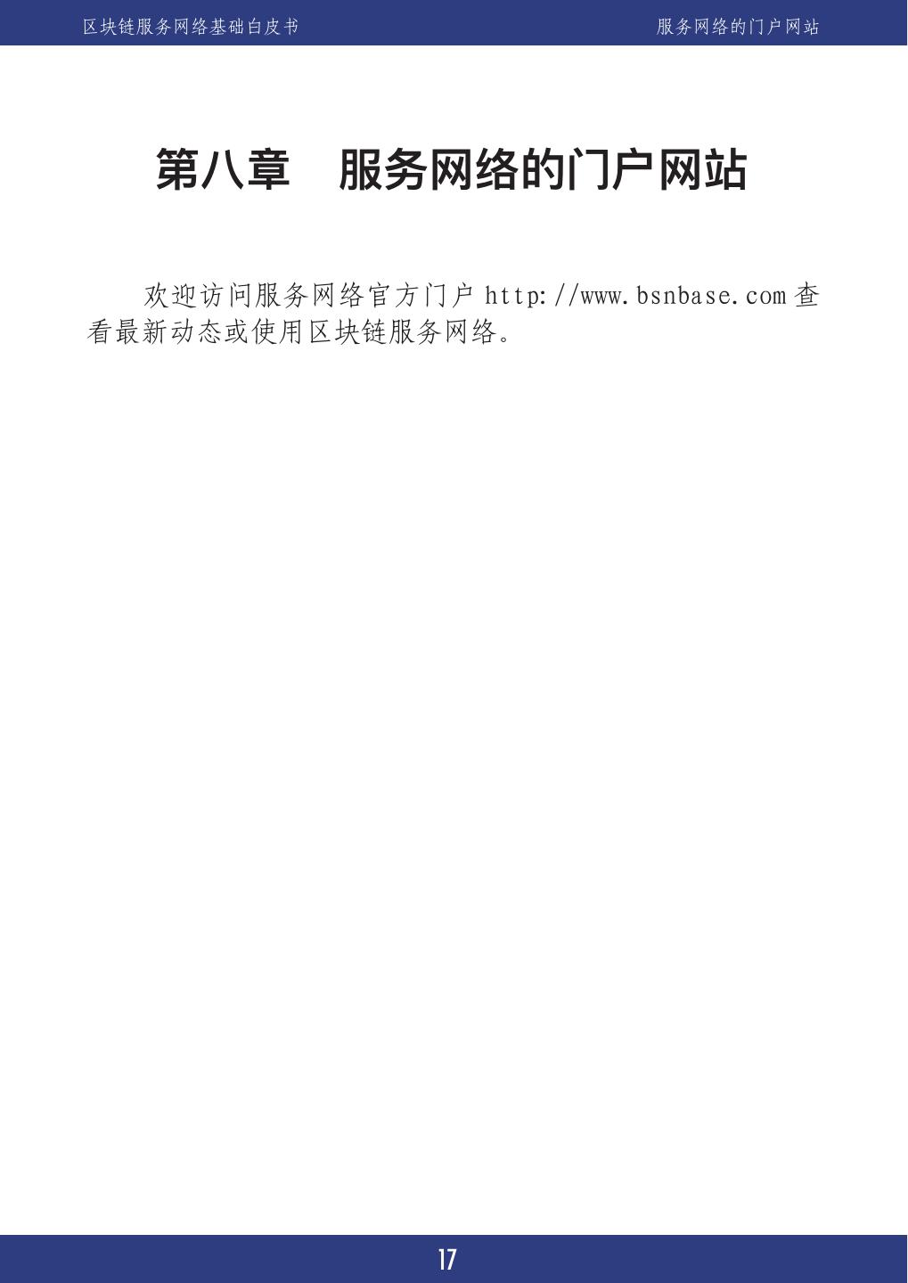 21 .区块链服务网络基础白皮书 服务网络的门户网站 第八章 服务网络的门户网站 服务欢迎访问服务网络官方门户 http://www.bsnbase.com 查 看最新动态或使用区块链服务网络。 17