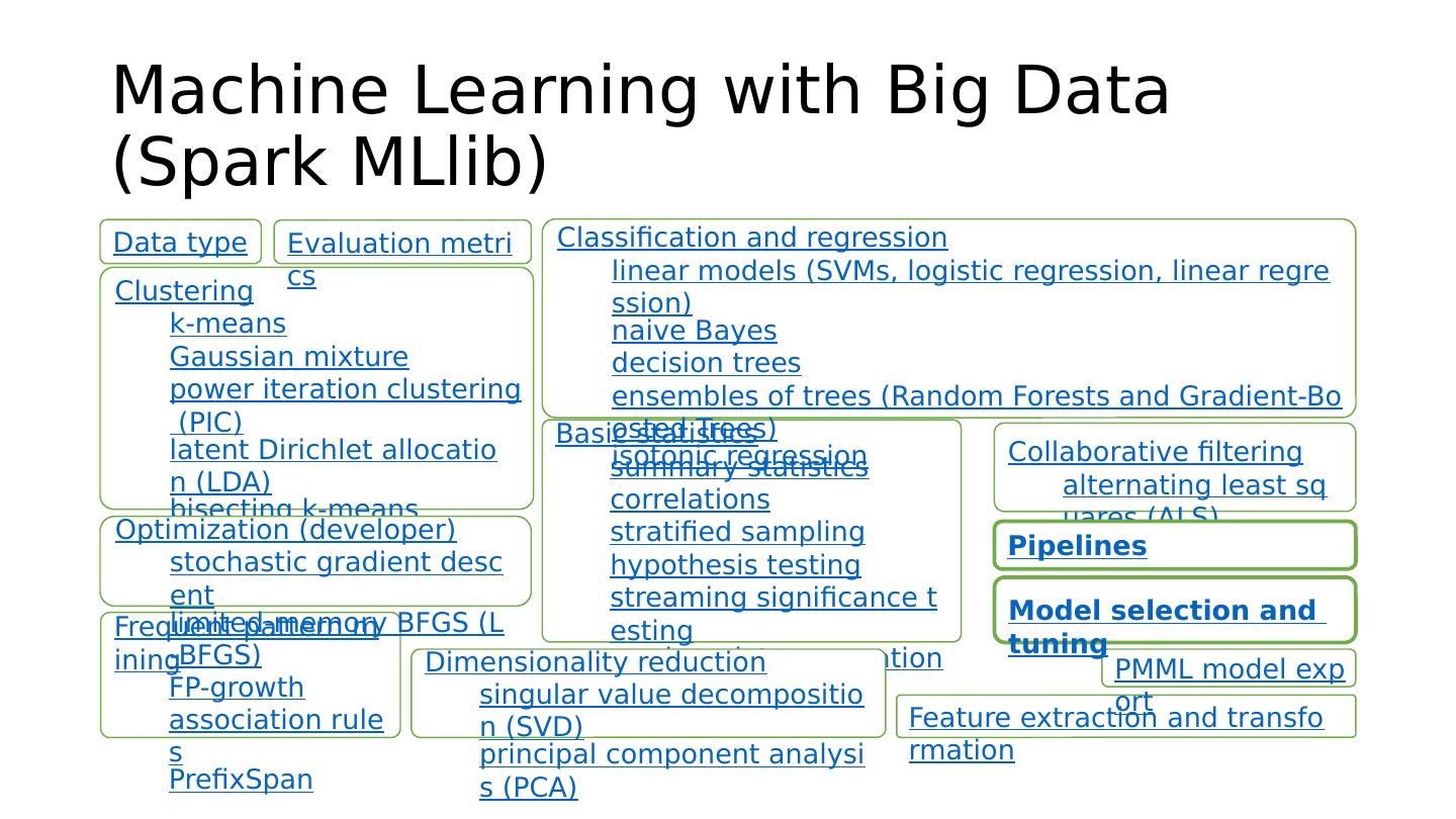 6 .Machine Learning with Big Data (Spark MLlib ) Data types Basic statistics summary statistics correlations stratified sampling hypothesis testing streaming significance testing random data generation Classification and regression linear models (SVMs, logistic regression, linear regression) naive Bayes decision trees ensembles of trees (Random Forests and Gradient-Boosted Trees) isotonic regression Collaborative filtering alternating least squares (ALS) Clustering k-means Gaussian mixture power iteration clustering (PIC) latent Dirichlet allocation (LDA) bisecting k-means streaming k-means Dimensionality reduction singular value decomposition (SVD) principal component analysis (PCA) Feature extraction and transformation Frequent pattern mining FP-growth association rules PrefixSpan Evaluation metrics PMML model export Optimization (developer) stochastic gradient descent limited-memory BFGS (L-BFGS) Pipelines Model selection and tuning