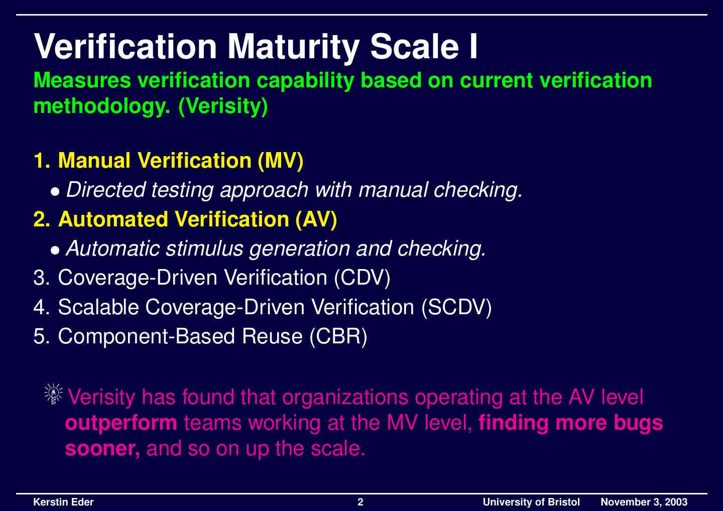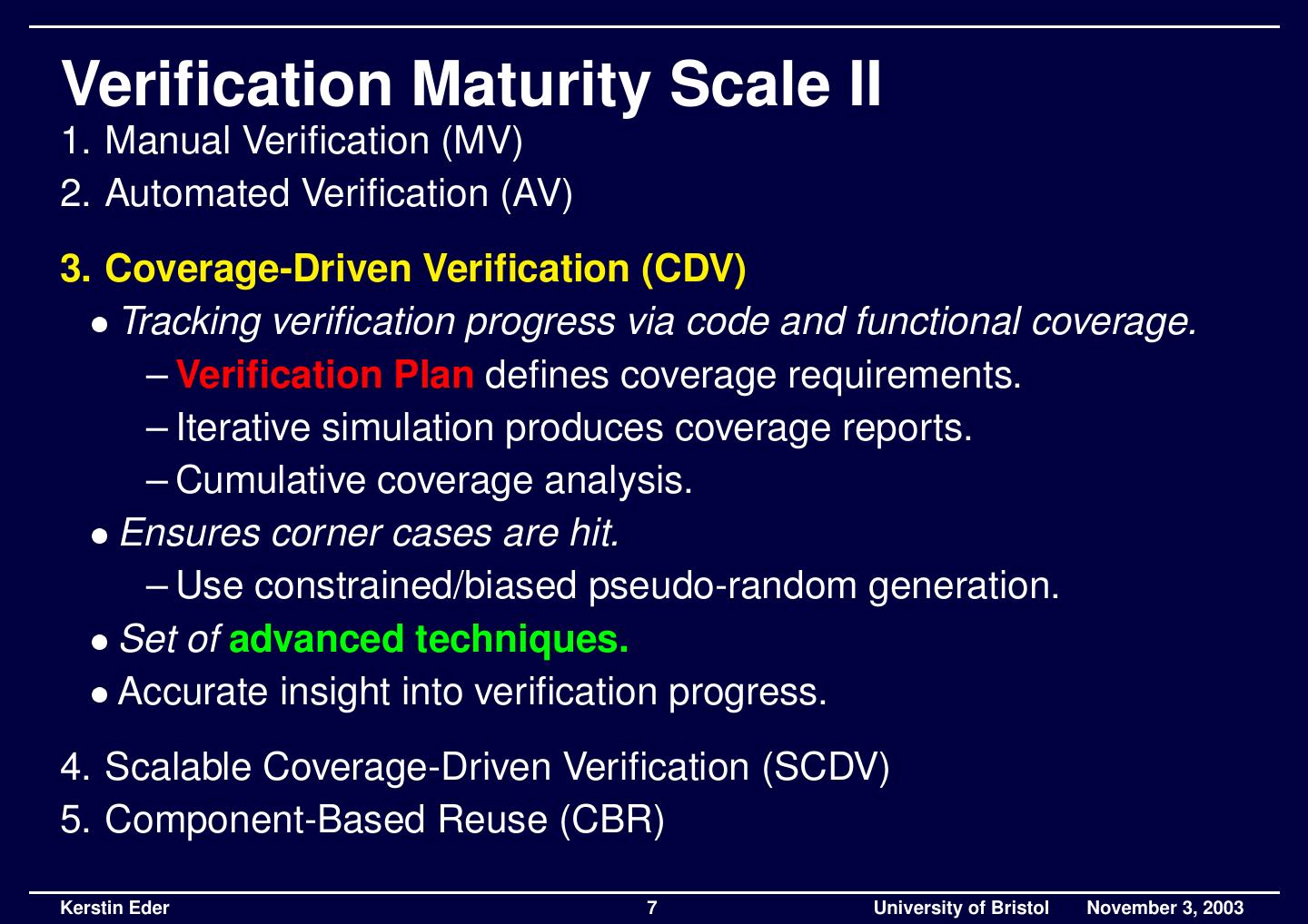 24 .Verification Maturity Scale IV 1. Manual Verification (MV) 2. Automated Verification (AV) 3. Coverage-Driven Verification (CDV) 4. Scalable Coverage-Driven Verification (SCDV) 5. Component-Based Reuse (CBR) Leveraging SCDT across multiple projects. Component-level reuse. eVCs Introduction of coding standards. AIM: Maximise return on verification investment. Verification Component - Bus X Masters Monitor and Bus Logic Protocol Slaves Checker Kerstin Eder 22 University of Bristol November 3, 2003