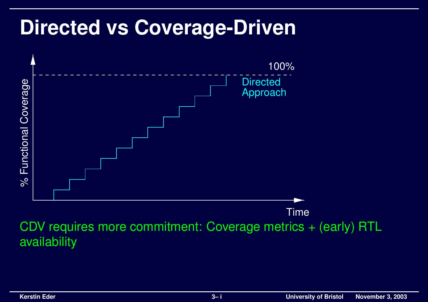 4 .Directed vs Coverage-Driven 100% Coverage-Driven Directed % Functional Coverage Approach Approach Time CDV requires more commitment: Coverage metrics + (early) RTL availability Kerstin Eder 3– ii University of Bristol November 3, 2003