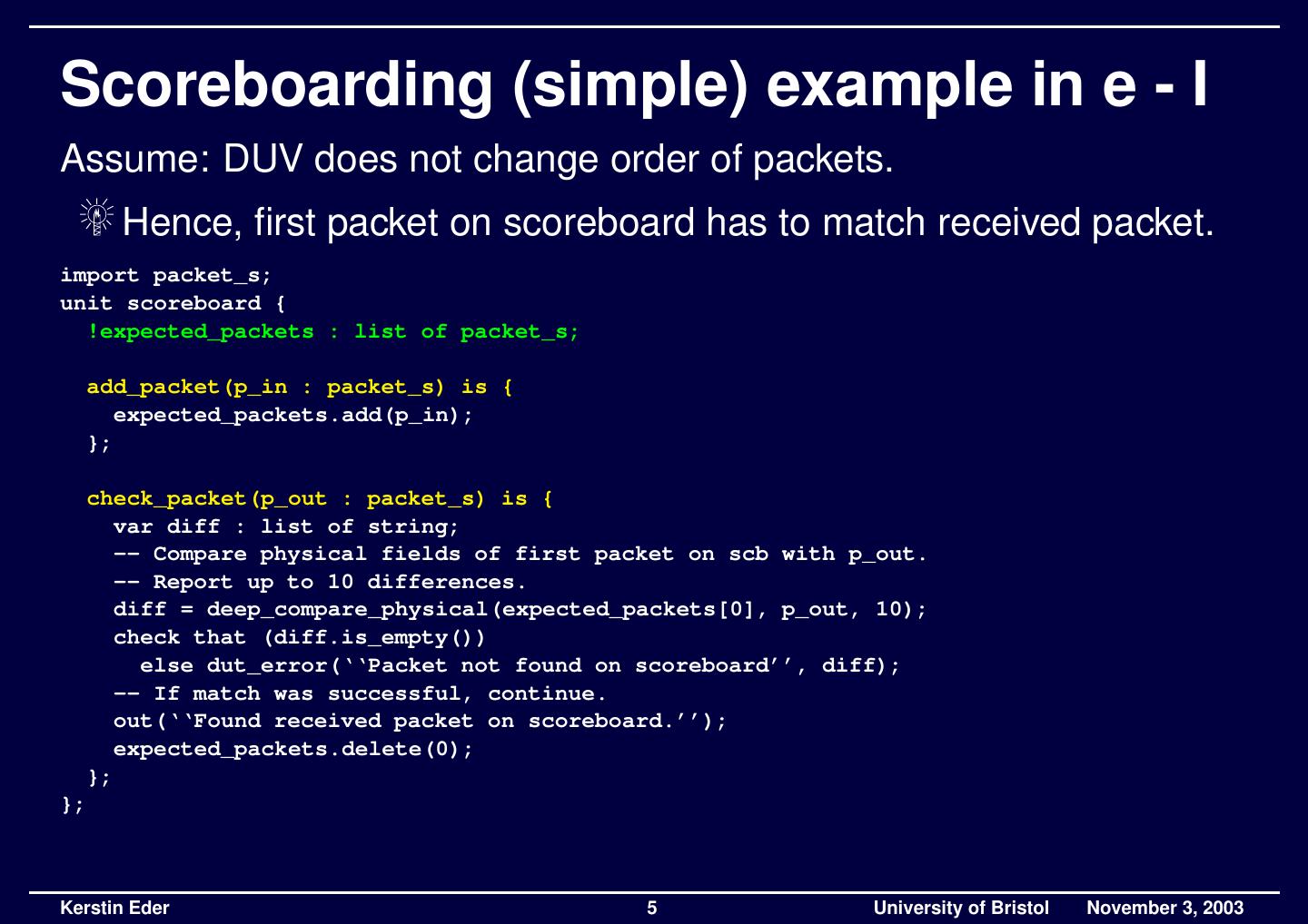 6 .Scoreboarding (simple) example in e - I Assume: DUV does not change order of packets. Hence, first packet on scoreboard has to match received packet. import packet_s; unit scoreboard { !expected_packets : list of packet_s; add_packet(p_in : packet_s) is { expected_packets.add(p_in); }; check_packet(p_out : packet_s) is { var diff : list of string; -- Compare physical fields of first packet on scb with p_out. -- Report up to 10 differences. diff = deep_compare_physical(expected_packets[0], p_out, 10); check that (diff.is_empty()) else dut_error(‘‘Packet not found on scoreboard’’, diff); -- If match was successful, continue. out(‘‘Found received packet on scoreboard.’’); expected_packets.delete(0); }; }; Kerstin Eder 5 University of Bristol November 3, 2003
