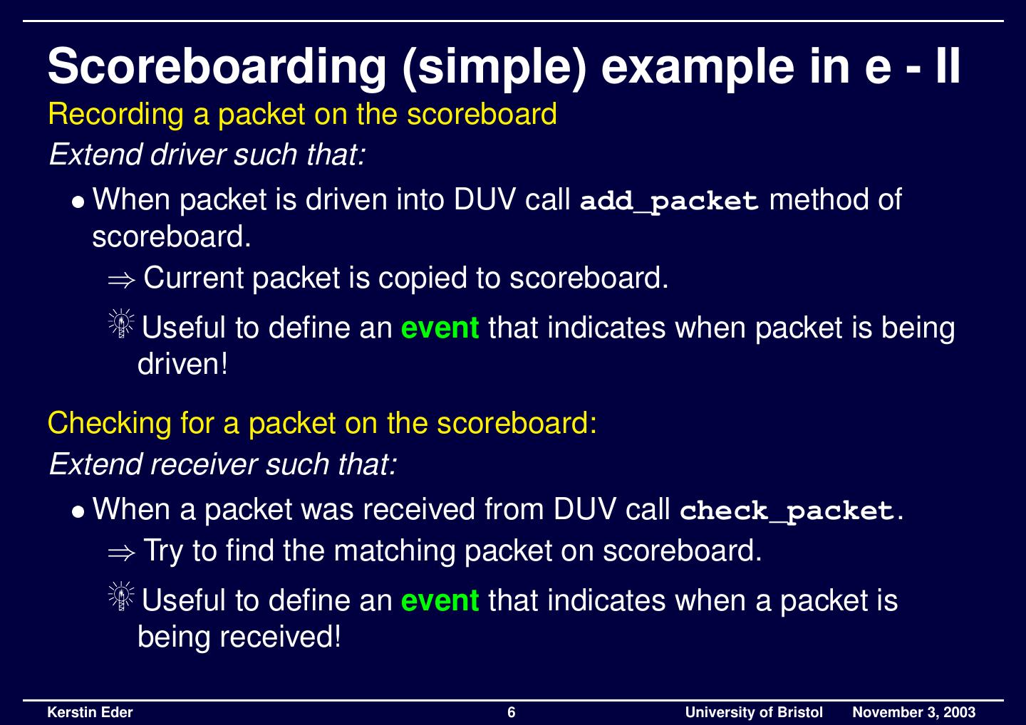 5 .Scoreboarding - Transaction-based Verification Put created transactions/packets on the scoreboard. Compare emerging transactions/packets. Collect output transactions/packets. Find corresponding item on scoreboard & delete. Use unique IDs. Account for transactions/packets that disappear. At the end, check that scoreboard is empty. Scoreboard Input Transaction Input Transaction add() Input Transaction match() Input Transaction DUV Output Transaction Kerstin Eder 4 University of Bristol November 3, 2003