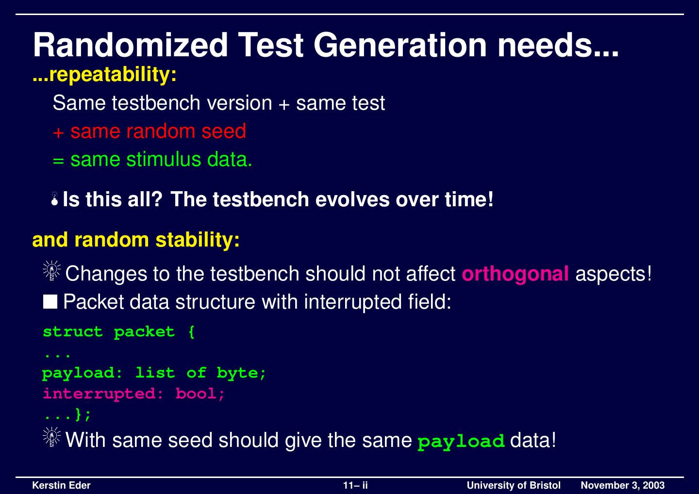 13 .Randomized Test Generation needs... ...repeatability: Same testbench version + same test + same random seed = same stimulus data. Is this all? The testbench evolves over time! and random stability: Changes to the testbench should not affect orthogonal aspects! Packet data structure with interrupted field: struct packet { ... payload: list of byte; interrupted: bool; ...}; With same seed should give the same payload data! Kerstin Eder 11– ii University of Bristol November 3, 2003