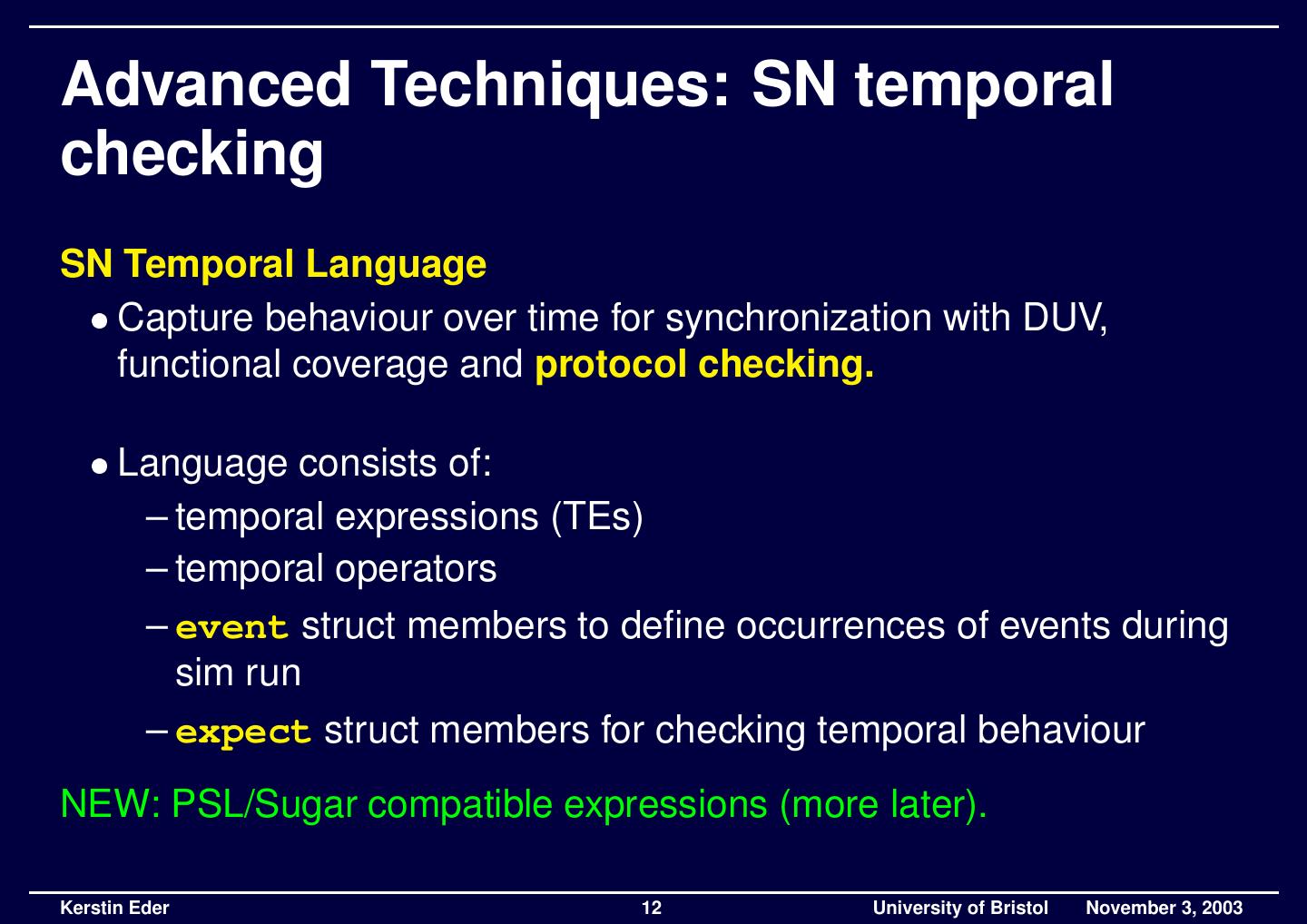 14 .Advanced Techniques: SN temporal checking SN Temporal Language Capture behaviour over time for synchronization with DUV, functional coverage and protocol checking. Language consists of: – temporal expressions (TEs) – temporal operators – event struct members to define occurrences of events during sim run – expect struct members for checking temporal behaviour NEW: PSL/Sugar compatible expressions (more later). Kerstin Eder 12 University of Bristol November 3, 2003