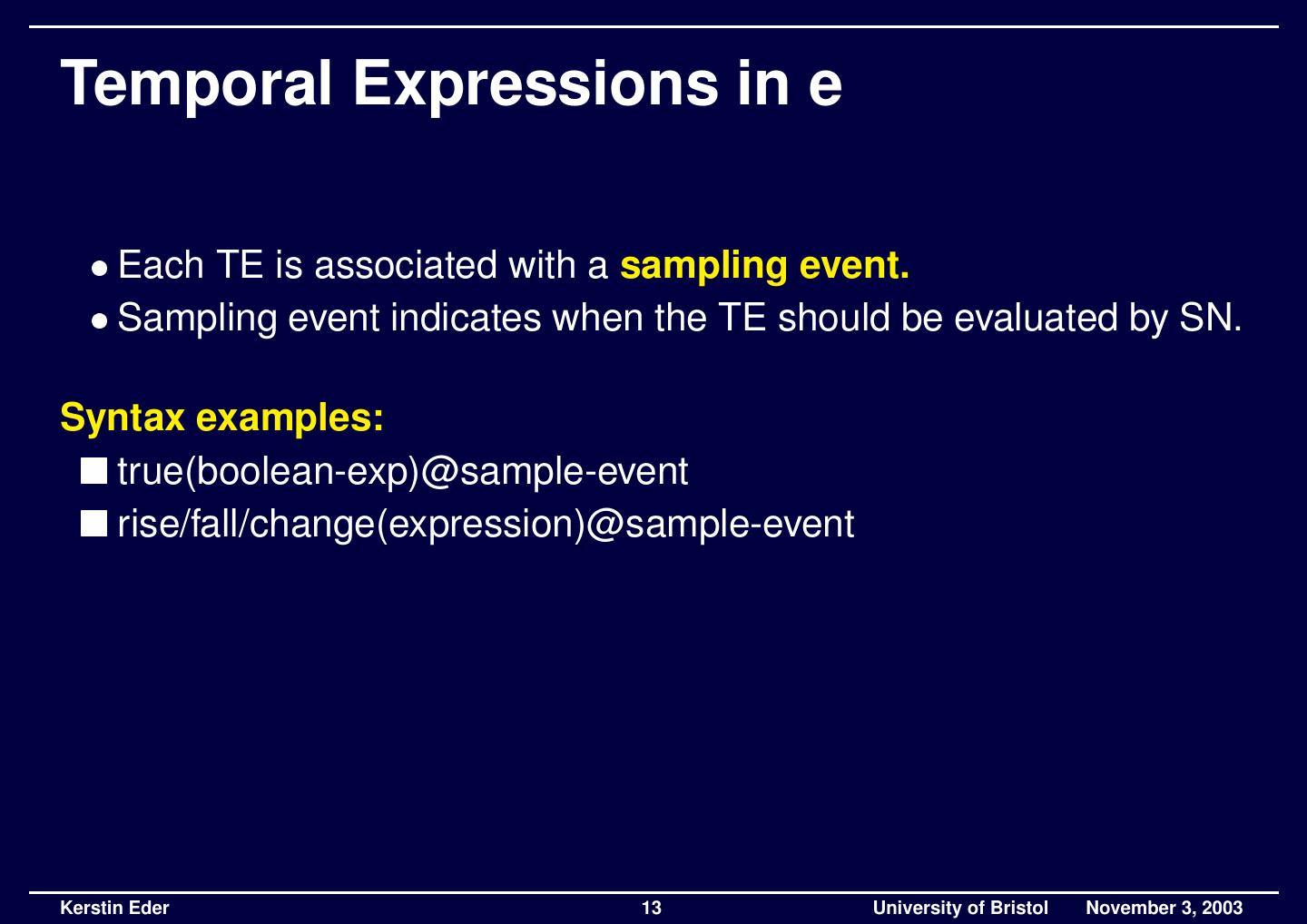 15 .Temporal Expressions in e Each TE is associated with a sampling event. Sampling event indicates when the TE should be evaluated by SN. Syntax examples: true(boolean-exp)@sample-event rise/fall/change(expression)@sample-event Kerstin Eder 13 University of Bristol November 3, 2003