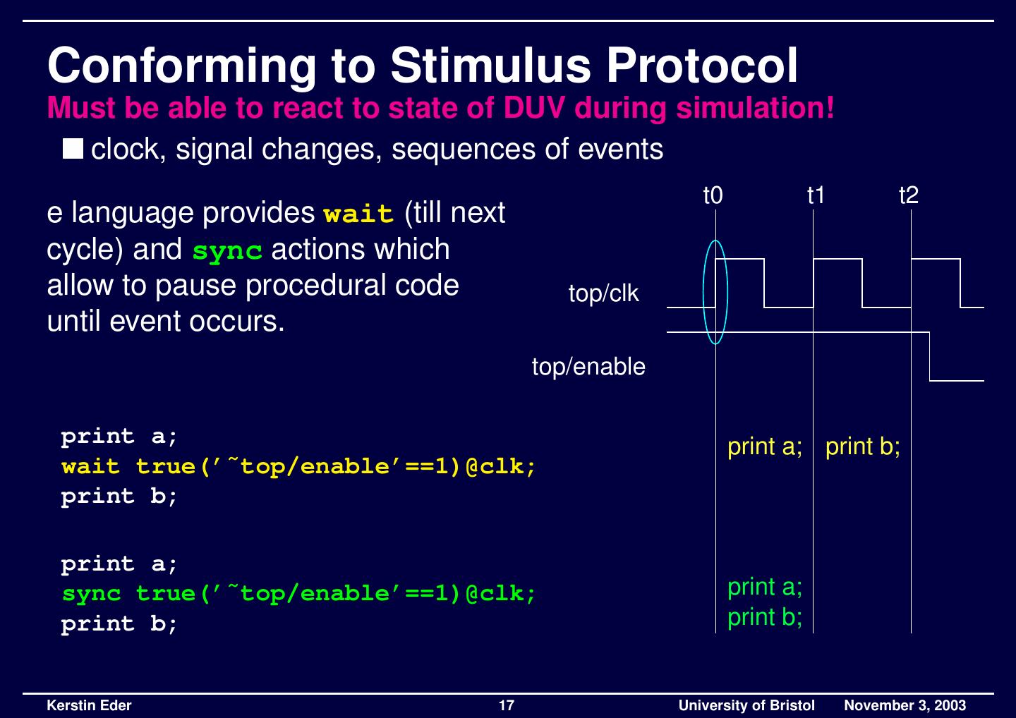 16 .Events in SN Events are used to synchronize with the DUV or to debug a test. Events are struct members. Automatic emission of events: <’ extend driver_s { event clk is fall(’calc1_sn.c_clk’) @sim; event resp is change(’calc1_sn.out_resp1’)@clk; }; ’> Explicit emission of event: <’ extend driver_s { collect_response(cmd : command_s) @clk is also { emit cmd.cmd_complete; }; }; ’> Kerstin Eder 14 University of Bristol November 3, 2003