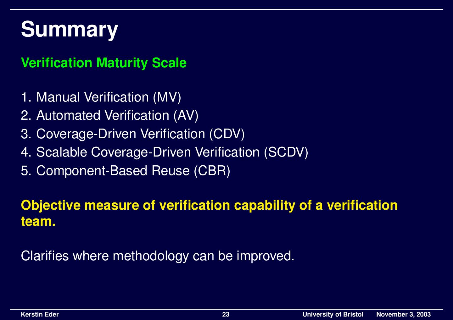 25 .Summary Verification Maturity Scale 1. Manual Verification (MV) 2. Automated Verification (AV) 3. Coverage-Driven Verification (CDV) 4. Scalable Coverage-Driven Verification (SCDV) 5. Component-Based Reuse (CBR) Objective measure of verification capability of a verification team. Clarifies where methodology can be improved. Kerstin Eder 23 University of Bristol November 3, 2003
