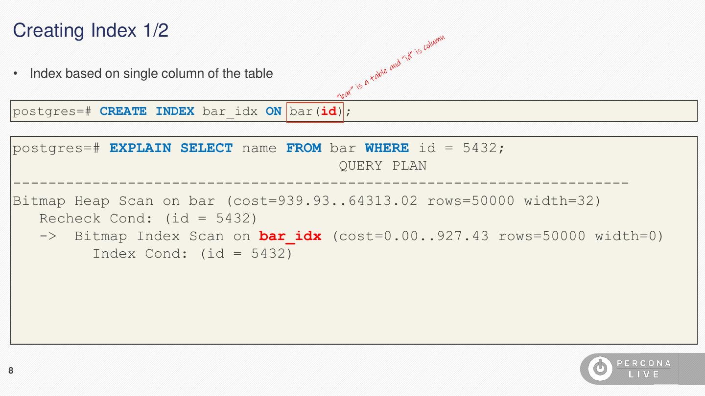 8 .Creating Index 1/2 • Index based on single column of the table postgres=# CREATE INDEX bar_idx ON bar(id); postgres=# EXPLAIN SELECT name FROM bar WHERE id = 5432; QUERY PLAN ---------------------------------------------------------------------- Bitmap Heap Scan on bar (cost=939.93..64313.02 rows=50000 width=32) Recheck Cond: (id = 5432) -> Bitmap Index Scan on bar_idx (cost=0.00..927.43 rows=50000 width=0) Index Cond: (id = 5432) 8