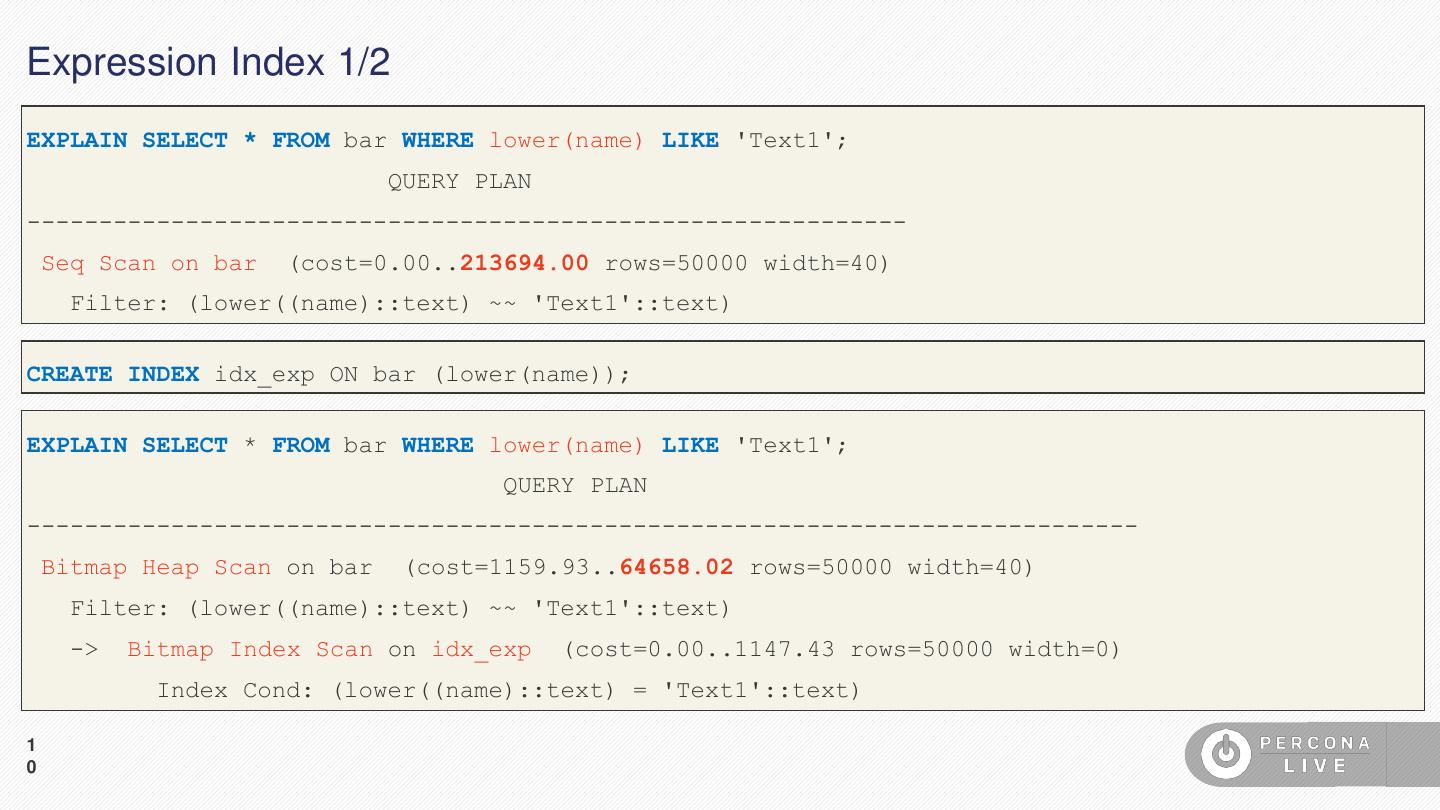 10 .Expression Index 1/2 EXPLAIN SELECT * FROM bar WHERE lower(name) LIKE 'Text1'; QUERY PLAN ------------------------------------------------------------- Seq Scan on bar (cost=0.00..213694.00 rows=50000 width=40) Filter: (lower((name)::text) ~~ 'Text1'::text) CREATE INDEX idx_exp ON bar (lower(name)); EXPLAIN SELECT * FROM bar WHERE lower(name) LIKE 'Text1'; QUERY PLAN ----------------------------------------------------------------------------- Bitmap Heap Scan on bar (cost=1159.93..64658.02 rows=50000 width=40) Filter: (lower((name)::text) ~~ 'Text1'::text) -> Bitmap Index Scan on idx_exp (cost=0.00..1147.43 rows=50000 width=0) Index Cond: (lower((name)::text) = 'Text1'::text) 1 0