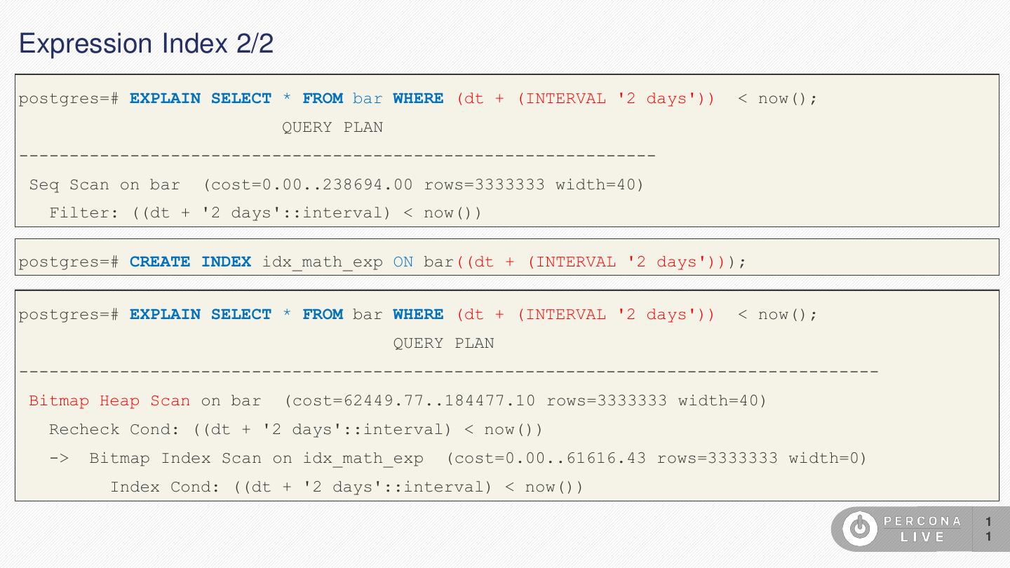 11 .Expression Index 2/2 postgres=# EXPLAIN SELECT * FROM bar WHERE (dt + (INTERVAL '2 days')) < now(); QUERY PLAN --------------------------------------------------------------- Seq Scan on bar (cost=0.00..238694.00 rows=3333333 width=40) Filter: ((dt + '2 days'::interval) < now()) postgres=# CREATE INDEX idx_math_exp ON bar((dt + (INTERVAL '2 days'))); postgres=# EXPLAIN SELECT * FROM bar WHERE (dt + (INTERVAL '2 days')) < now(); QUERY PLAN ------------------------------------------------------------------------------------- Bitmap Heap Scan on bar (cost=62449.77..184477.10 rows=3333333 width=40) Recheck Cond: ((dt + '2 days'::interval) < now()) -> Bitmap Index Scan on idx_math_exp (cost=0.00..61616.43 rows=3333333 width=0) Index Cond: ((dt + '2 days'::interval) < now()) 1 1