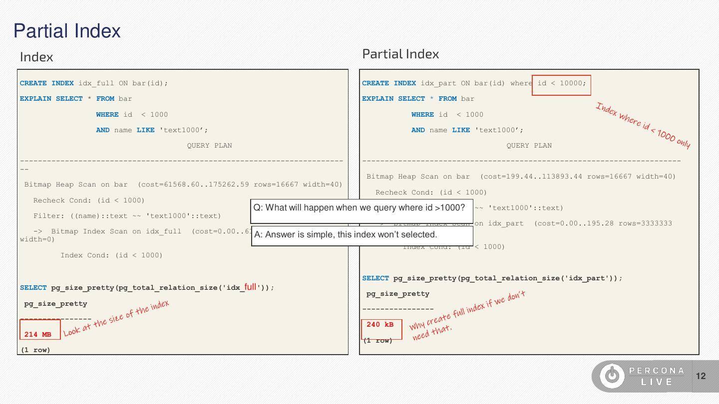12 .Partial Index Index Partial Index CREATE INDEX idx_full ON bar(id); CREATE INDEX idx_part ON bar(id) where id < 10000; EXPLAIN SELECT * FROM bar EXPLAIN SELECT * FROM bar WHERE id < 1000 WHERE id < 1000 AND name LIKE 'text1000’; AND name LIKE 'text1000’; QUERY PLAN QUERY PLAN ------------------------------------------------------------------------ ----------------------------------------------------------------------- -- Bitmap Heap Scan on bar (cost=199.44..113893.44 rows=16667 width=40) Bitmap Heap Scan on bar (cost=61568.60..175262.59 rows=16667 width=40) Recheck Cond: (id < 1000) Recheck Cond: (id < 1000) Filter: Q: What will happen when we query ((name)::text where id >1000? ~~ 'text1000'::text) Filter: ((name)::text ~~ 'text1000'::text) -> Bitmap Index Scan on idx_part (cost=0.00..195.28 rows=3333333 -> Bitmap Index Scan on idx_full (cost=0.00..61564.43 rows=3333333 width=0) width=0) A: Answer is simple, this index won’t selected. Index Cond: (id < 1000) Index Cond: (id < 1000) SELECT pg_size_pretty(pg_total_relation_size('idx_part')); SELECT pg_size_pretty(pg_total_relation_size('idx_full')); pg_size_pretty pg_size_pretty ---------------- ---------------- 240 kB 214 MB (1 row) (1 row) 12