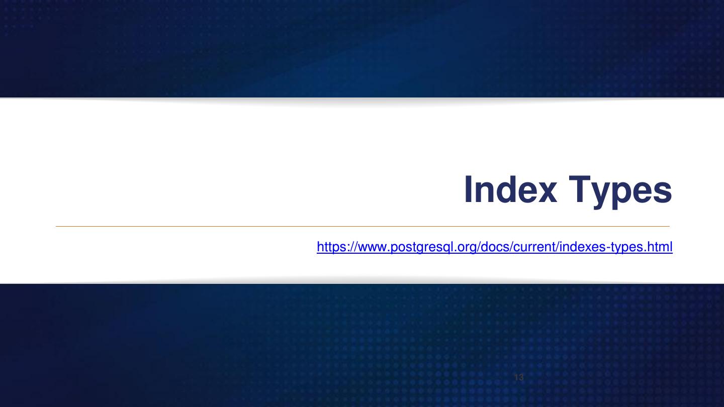 13 . Index Types https://www.postgresql.org/docs/current/indexes-types.html 13