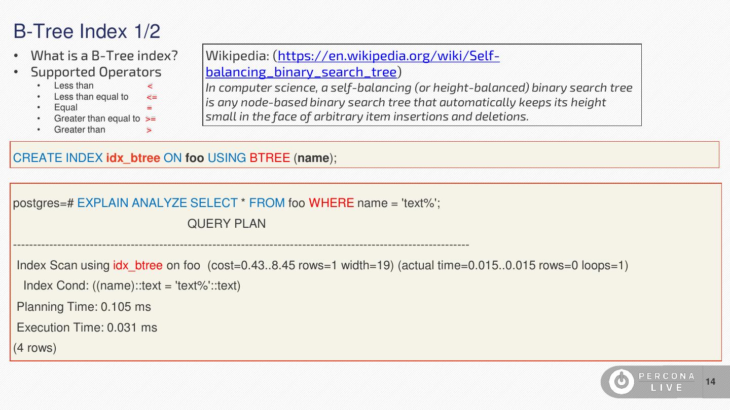14 .B-Tree Index 1/2 • What is a B-Tree index? Wikipedia: (https://en.wikipedia.org/wiki/Self- • Supported Operators balancing_binary_search_tree) • Less than < In computer science, a self-balancing (or height-balanced) binary search tree • Less than equal to <= • Equal = is any node-based binary search tree that automatically keeps its height • Greater than equal to >= small in the face of arbitrary item insertions and deletions. • Greater than > CREATE INDEX idx_btree ON foo USING BTREE (name); postgres=# EXPLAIN ANALYZE SELECT * FROM foo WHERE name = 'text%'; QUERY PLAN ---------------------------------------------------------------------------------------------------------------- Index Scan using idx_btree on foo (cost=0.43..8.45 rows=1 width=19) (actual time=0.015..0.015 rows=0 loops=1) Index Cond: ((name)::text = 'text%'::text) Planning Time: 0.105 ms Execution Time: 0.031 ms (4 rows) 14