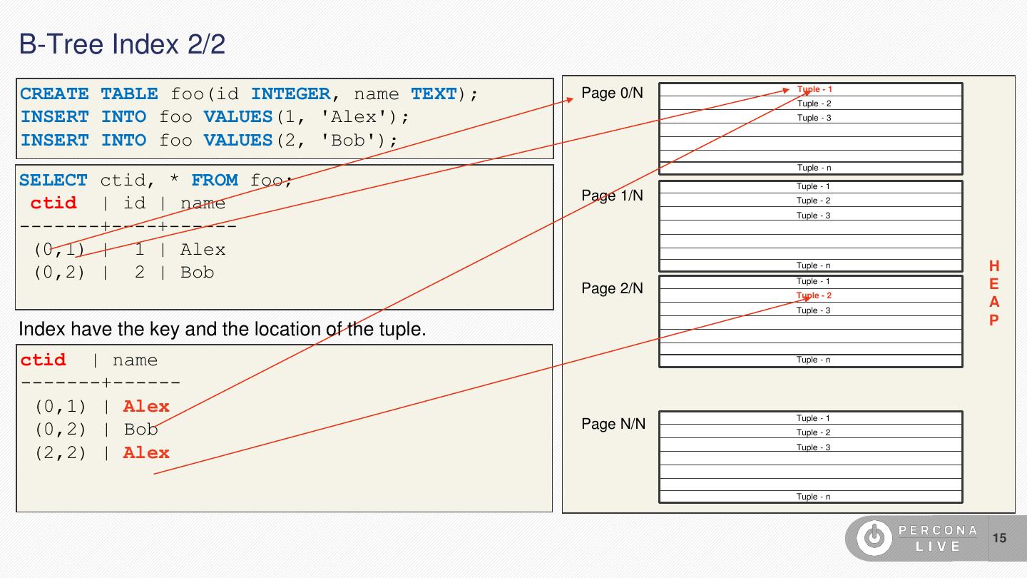 15 .B-Tree Index 2/2 CREATE TABLE foo(id INTEGER, name TEXT); Page 0/N Tuple - 1 Tuple - 2 INSERT INTO foo VALUES(1, 'Alex'); Tuple - 3 INSERT INTO foo VALUES(2, 'Bob'); Tuple - n SELECT ctid, * FROM foo; Tuple - 1 Page 1/N ctid | id | name Tuple - 2 Tuple - 3 -------+----+------ (0,1) | 1 | Alex (0,2) | 2 | Bob Tuple - n H Tuple - 1 Page 2/N E Tuple - 2 Tuple - 3 A P Index have the key and the location of the tuple. ctid | name Tuple - n -------+------ (0,1) | Alex Tuple - 1 (0,2) | Bob Page N/N Tuple - 2 (2,2) | Alex Tuple - 3 Tuple - n 15