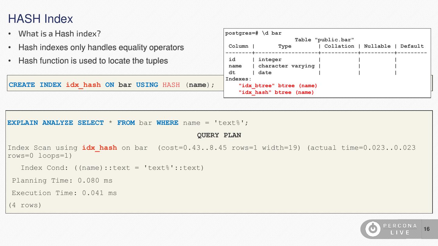 16 .HASH Index • What is a Hash index? postgres=# \d bar Table "public.bar" • Hash indexes only handles equality operators Column | Type | Collation | Nullable | Default --------+-------------------+-----------+----------+--------- • Hash function is used to locate the tuples id name | integer | | character varying | | | | | dt | date | | | Indexes: CREATE INDEX idx_hash ON bar USING HASH (name); "idx_btree" btree (name) "idx_hash" btree (name) EXPLAIN ANALYZE SELECT * FROM bar WHERE name = 'text%'; QUERY PLAN Index Scan using idx_hash on bar (cost=0.43..8.45 rows=1 width=19) (actual time=0.023..0.023 rows=0 loops=1) Index Cond: ((name)::text = 'text%'::text) Planning Time: 0.080 ms Execution Time: 0.041 ms (4 rows) 16
