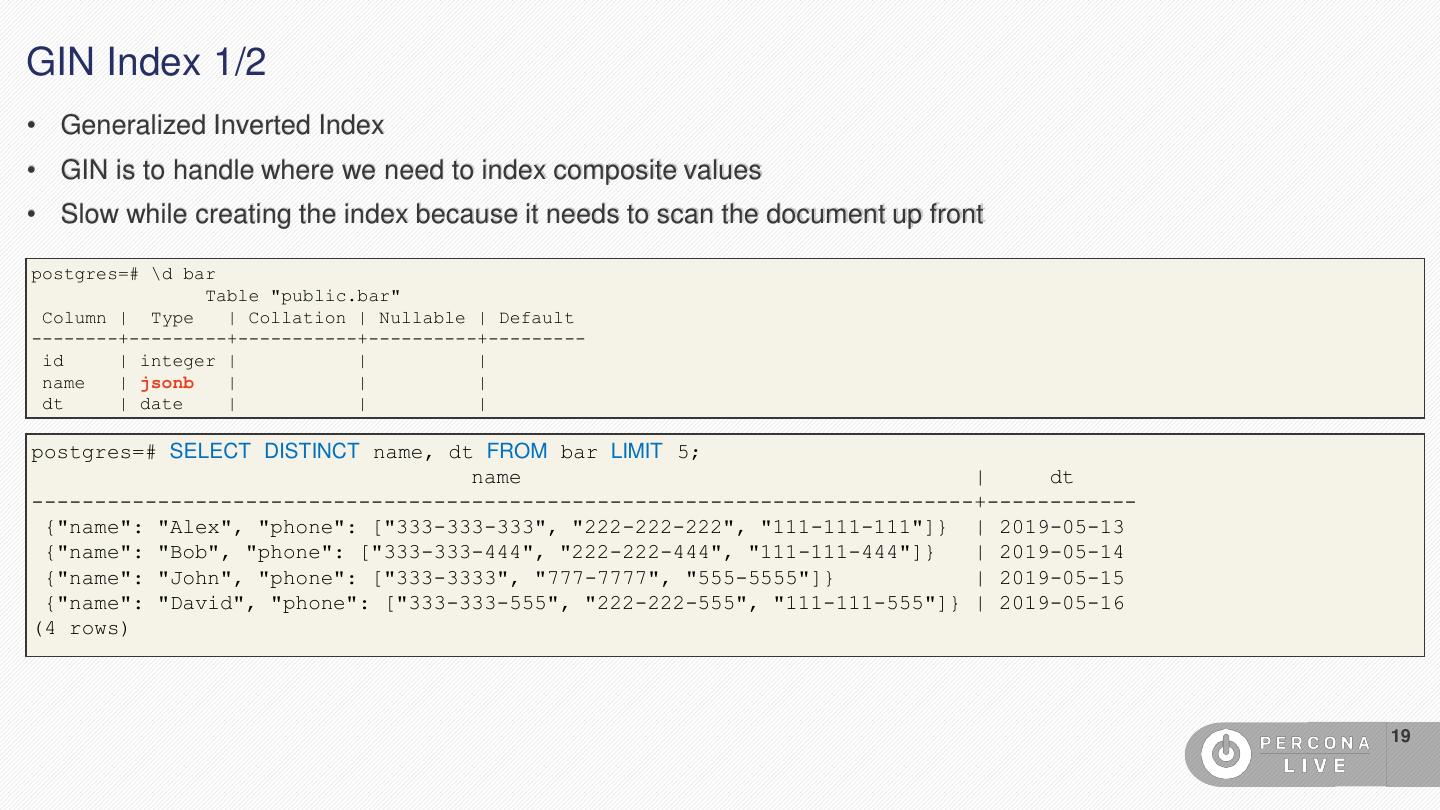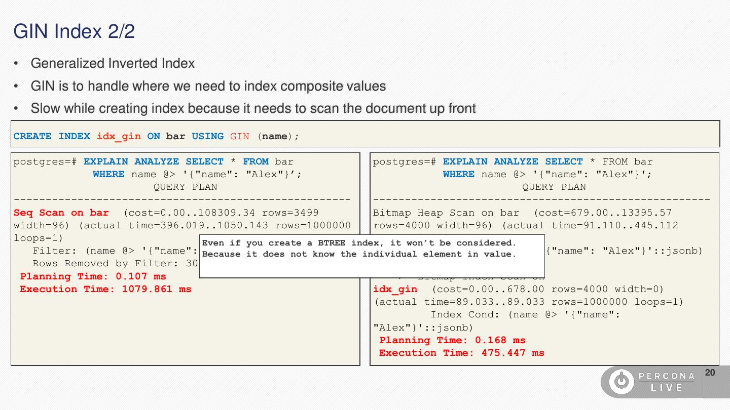 19 .GIN Index 1/2 • Generalized Inverted Index • GIN is to handle where we need to index composite values • Slow while creating the index because it needs to scan the document up front postgres=# \d bar Table "public.bar" Column | Type | Collation | Nullable | Default --------+---------+-----------+----------+--------- id | integer | | | name | jsonb | | | dt | date | | | postgres=# SELECT DISTINCT name, dt FROM bar LIMIT 5; name | dt ---------------------------------------------------------------------------+------------ {"name": "Alex", "phone": ["333-333-333", "222-222-222", "111-111-111"]} | 2019-05-13 {"name": "Bob", "phone": ["333-333-444", "222-222-444", "111-111-444"]} | 2019-05-14 {"name": "John", "phone": ["333-3333", "777-7777", "555-5555"]} | 2019-05-15 {"name": "David", "phone": ["333-333-555", "222-222-555", "111-111-555"]} | 2019-05-16 (4 rows) 19