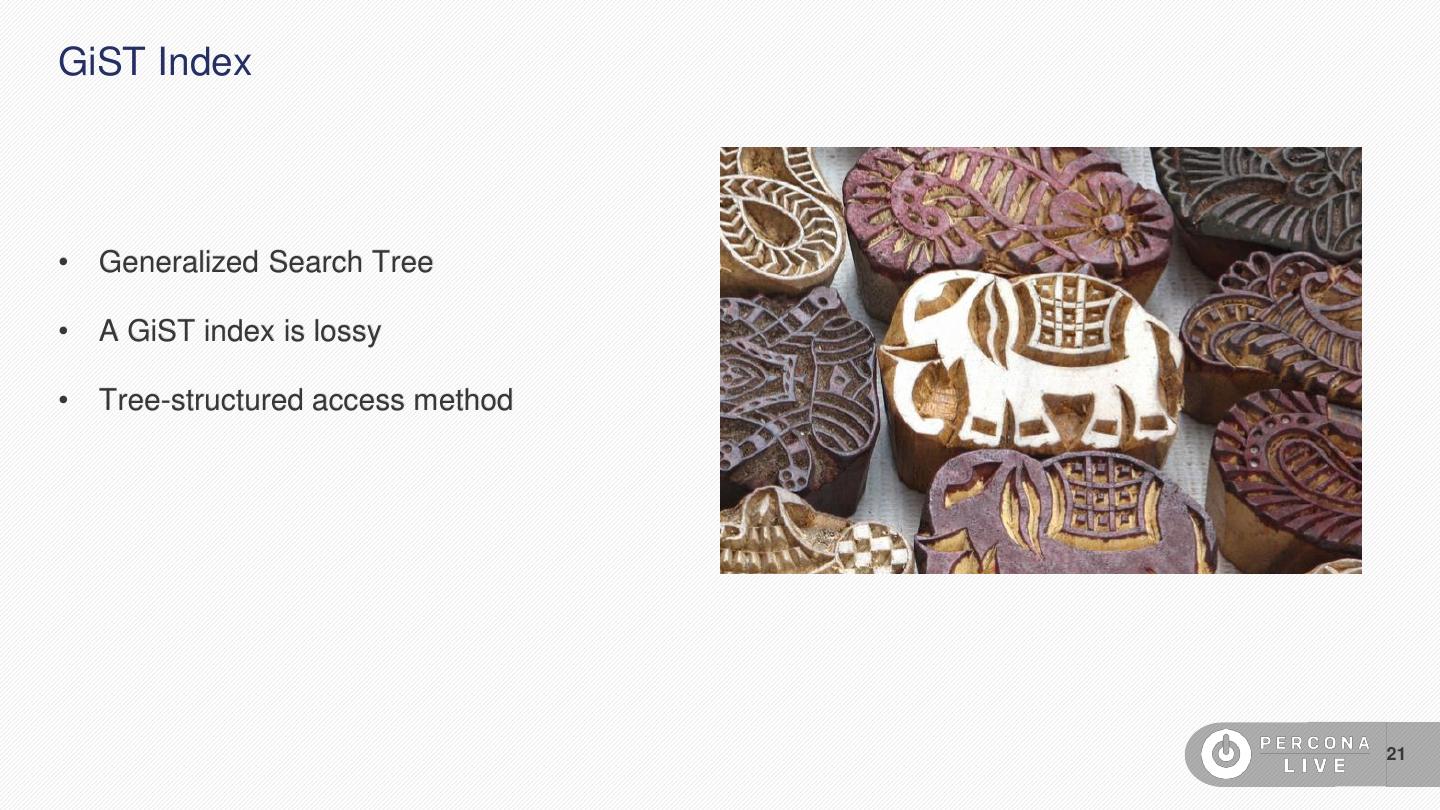 21 .GiST Index • Generalized Search Tree • A GiST index is lossy • Tree-structured access method 21
