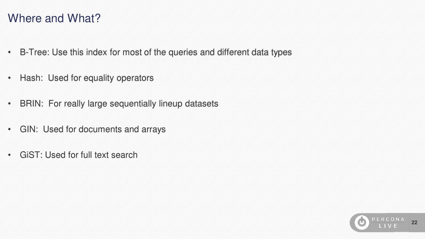 22 .Where and What? • B-Tree: Use this index for most of the queries and different data types • Hash: Used for equality operators • BRIN: For really large sequentially lineup datasets • GIN: Used for documents and arrays • GiST: Used for full text search 22