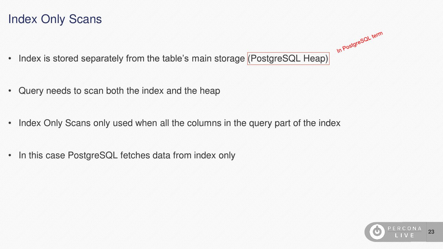 23 .Index Only Scans • Index is stored separately from the table’s main storage (PostgreSQL Heap) • Query needs to scan both the index and the heap • Index Only Scans only used when all the columns in the query part of the index • In this case PostgreSQL fetches data from index only 23