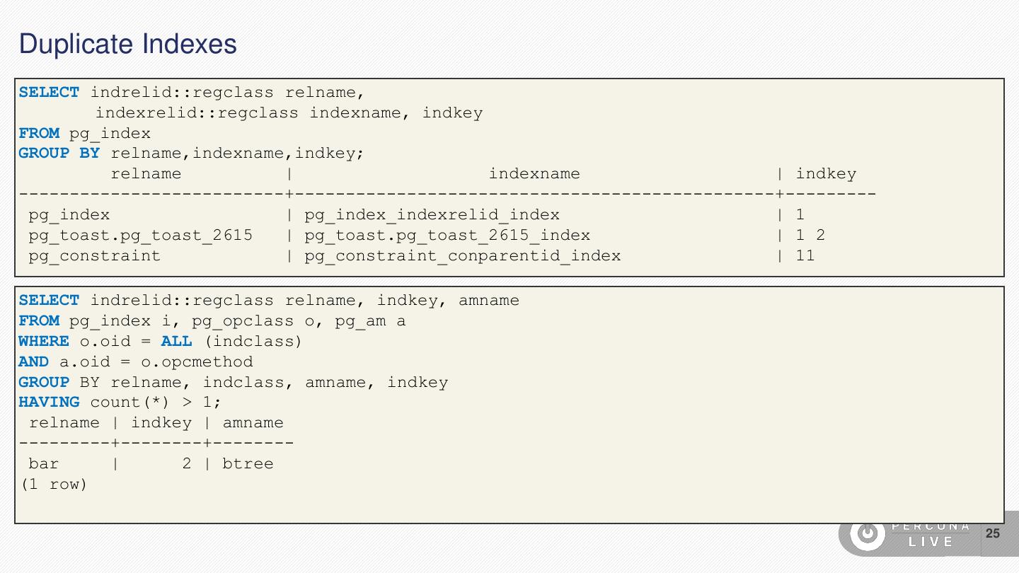 25 .Duplicate Indexes SELECT indrelid::regclass relname, indexrelid::regclass indexname, indkey FROM pg_index GROUP BY relname,indexname,indkey; relname | indexname | indkey --------------------------+-----------------------------------------------+--------- pg_index | pg_index_indexrelid_index | 1 pg_toast.pg_toast_2615 | pg_toast.pg_toast_2615_index | 1 2 pg_constraint | pg_constraint_conparentid_index | 11 SELECT indrelid::regclass relname, indkey, amname FROM pg_index i, pg_opclass o, pg_am a WHERE o.oid = ALL (indclass) AND a.oid = o.opcmethod GROUP BY relname, indclass, amname, indkey HAVING count(*) > 1; relname | indkey | amname ---------+--------+-------- bar | 2 | btree (1 row) 25