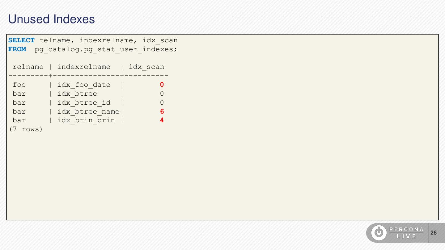 26 .Unused Indexes SELECT relname, indexrelname, idx_scan FROM pg_catalog.pg_stat_user_indexes; relname | indexrelname | idx_scan ---------+---------------+---------- foo | idx_foo_date | 0 bar | idx_btree | 0 bar | idx_btree_id | 0 bar | idx_btree_name| 6 bar | idx_brin_brin | 4 (7 rows) 26
