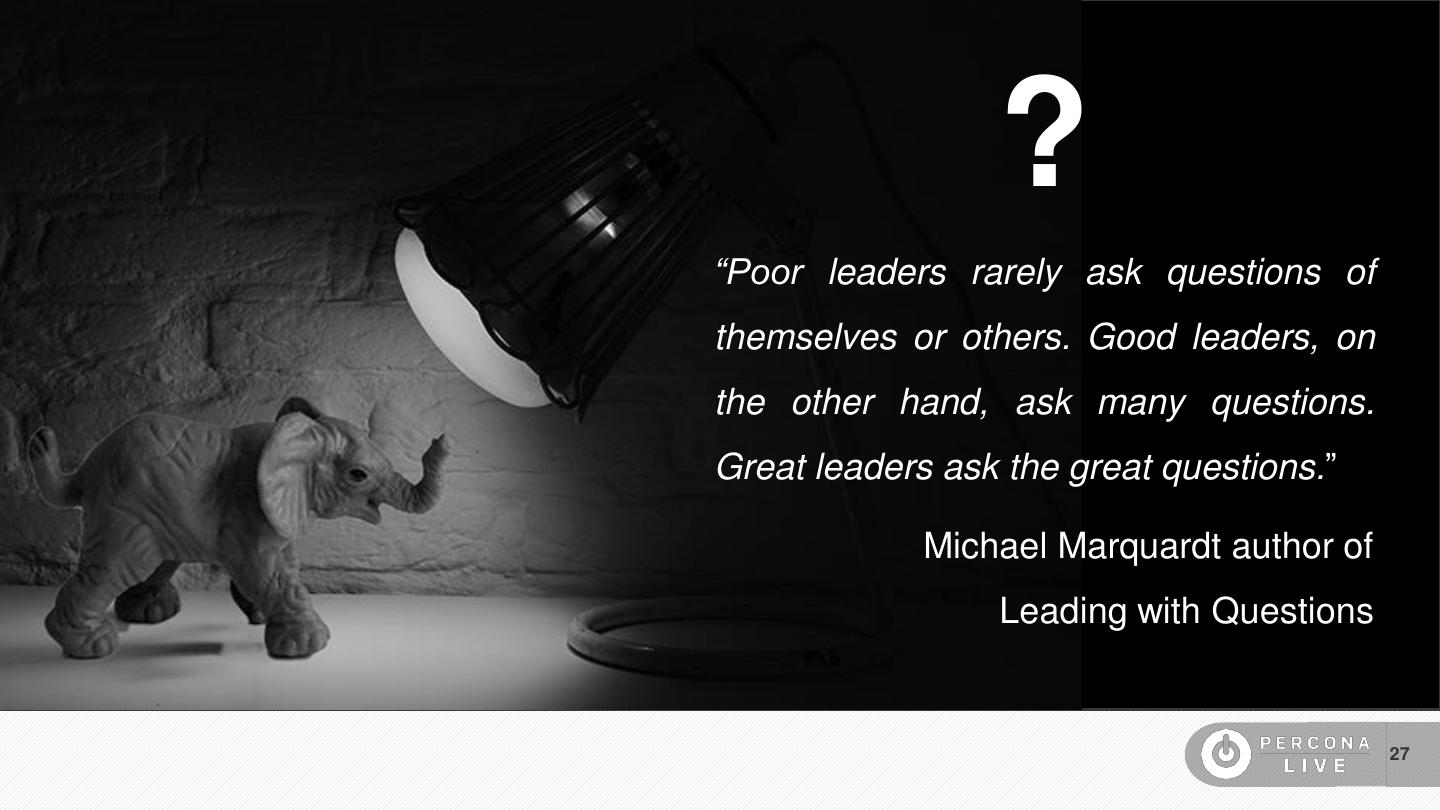 27 . ? “Poor leaders rarely ask questions of themselves or others. Good leaders, on the other hand, ask many questions. Great leaders ask the great questions.” Michael Marquardt author of Leading with Questions 27
