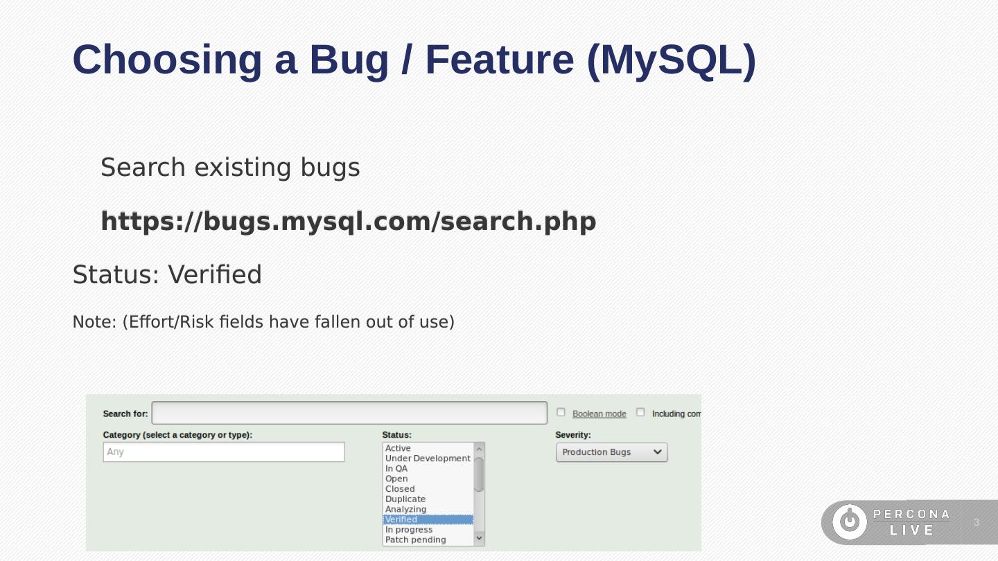3 .Choosing a Bug / Feature (MySQL) Search existing bugs https://bugs.mysql.com/search.php Status: Verified Note: (Effort/Risk fields have fallen out of use) 3