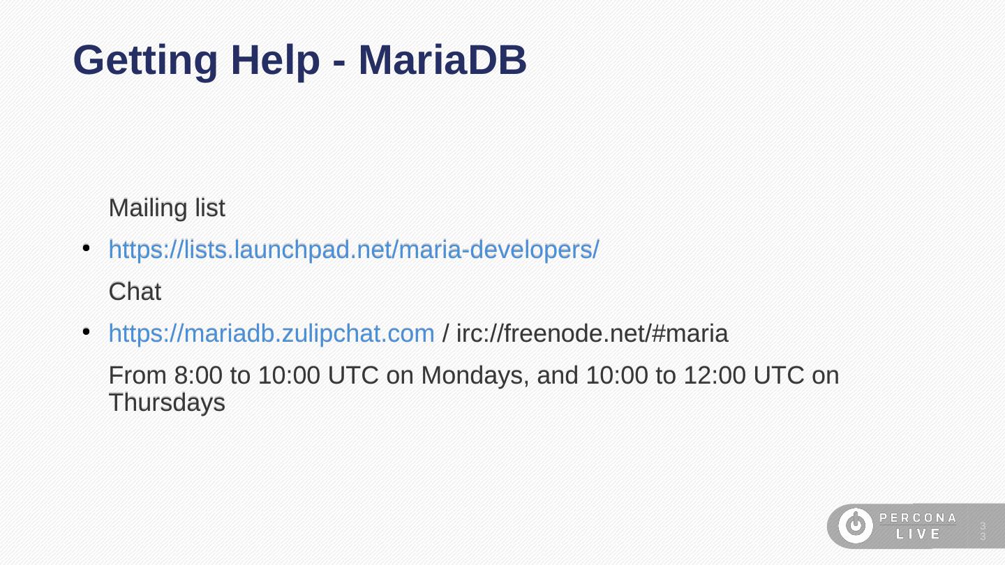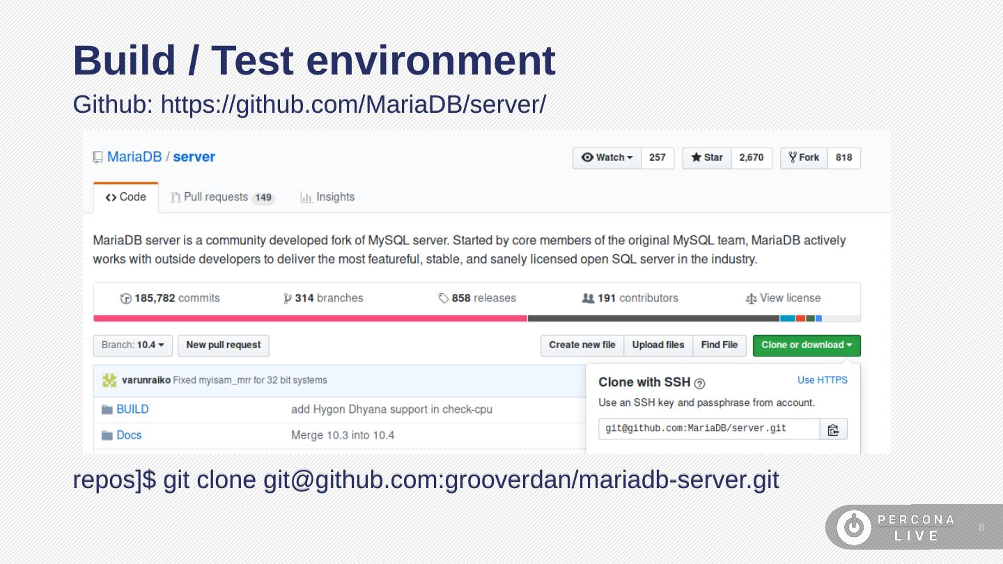 8 .Build / Test environment Github: https://github.com/MariaDB/server/ repos]$ git clone git@github.com:grooverdan/mariadb-server.git 8