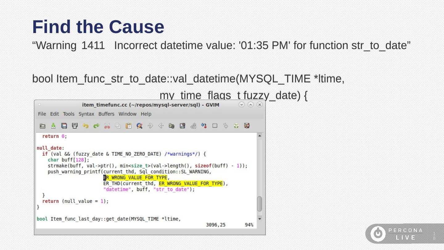 18 .Find the Cause “Warning 1411 Incorrect datetime value: '01:35 PM' for function str_to_date” bool Item_func_str_to_date::val_datetime(MYSQL_TIME *ltime, my_time_flags_t fuzzy_date) { 1 8