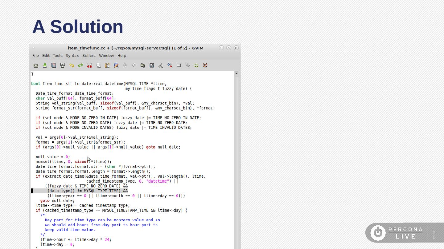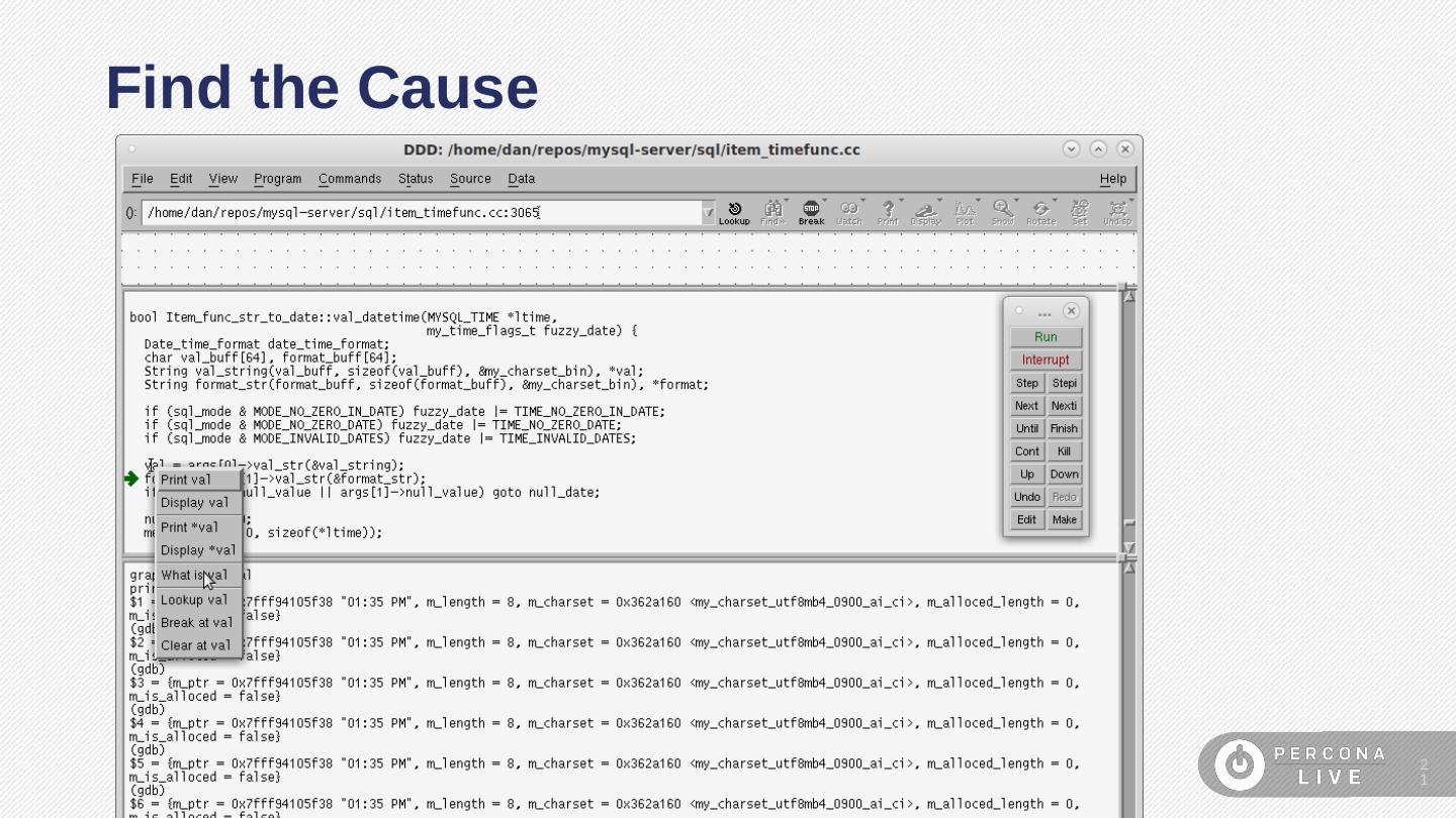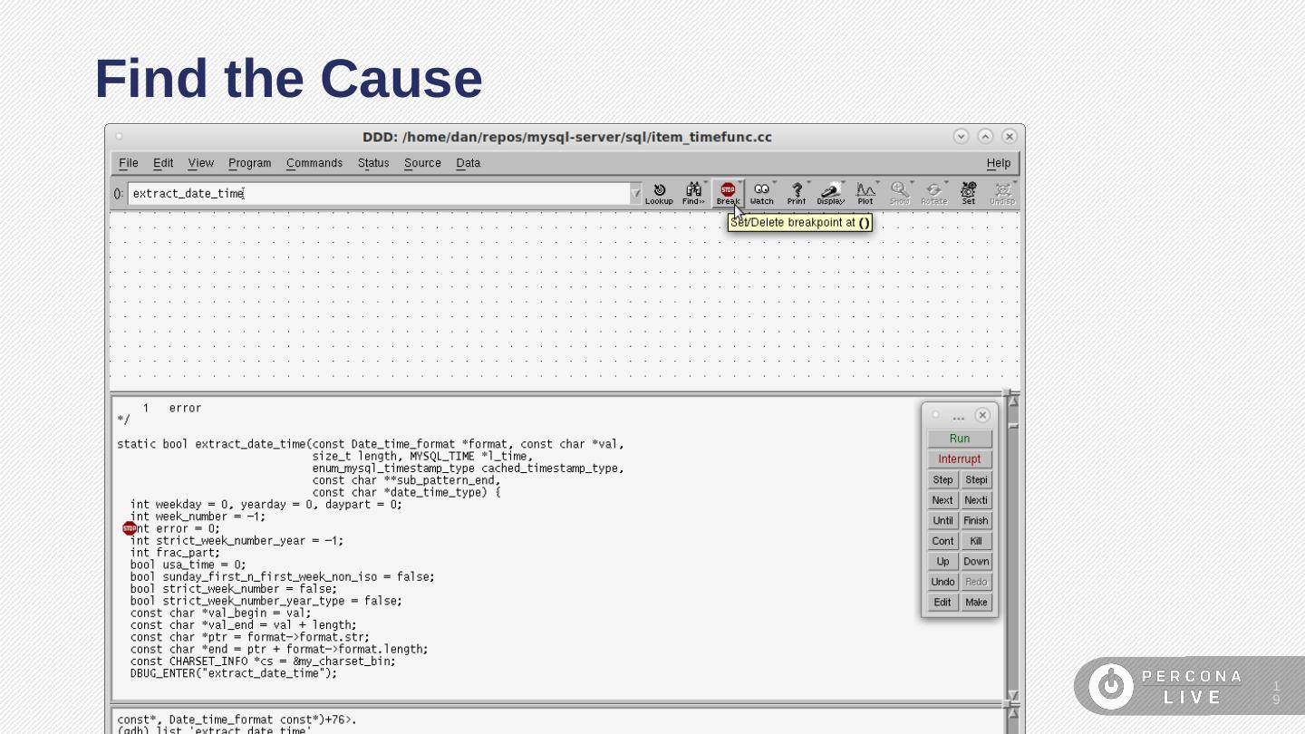 24 .Find the Cause mysql-server]$ cat ./mysql-test/t/bug71386.test SELECT STR_TO_DATE('1/1/2010', '%m/%d/%Y'); SELECT STR_TO_DATE('1/1/2010 01:35 PM', '%m/%d/%Y %h:%i %p'); SELECT STR_TO_DATE('01:35 PM', '%h:%i %p'); ; Thread 42 "mysqld" hit Breakpoint 2, Item_func_str_to_date::val_datetime (this=0x7fff941064e8, ltime=0x7fffec06d510, fuzzy_date=1) at /home/dan/repos/mysql- server/sql/item_timefunc.cc:3059 (gdb) p data_type() $1 = MYSQL_TYPE_DATE (gdb) cont Continuing. (gdb) p data_type() $2 = MYSQL_TYPE_DATETIME (gdb) cont Continuing. (gdb) p data_type() $3 = MYSQL_TYPE_TIME 2 4