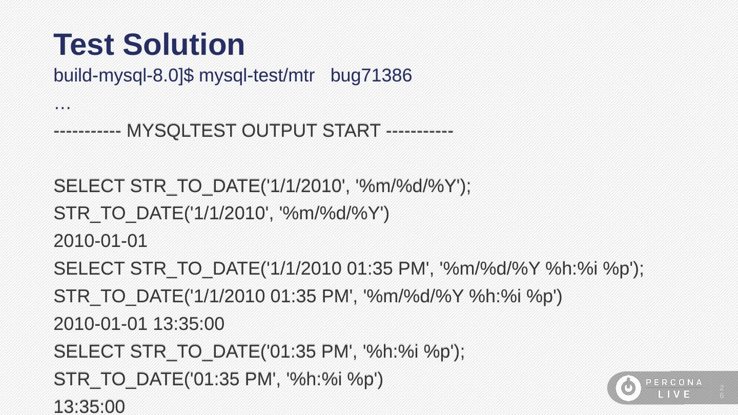 26 .Test Solution build-mysql-8.0]$ mysql-test/mtr bug71386 … ----------- MYSQLTEST OUTPUT START ----------- SELECT STR_TO_DATE('1/1/2010', '%m/%d/%Y'); STR_TO_DATE('1/1/2010', '%m/%d/%Y') 2010-01-01 SELECT STR_TO_DATE('1/1/2010 01:35 PM', '%m/%d/%Y %h:%i %p'); STR_TO_DATE('1/1/2010 01:35 PM', '%m/%d/%Y %h:%i %p') 2010-01-01 13:35:00 SELECT STR_TO_DATE('01:35 PM', '%h:%i %p'); STR_TO_DATE('01:35 PM', '%h:%i %p') 2 6 13:35:00