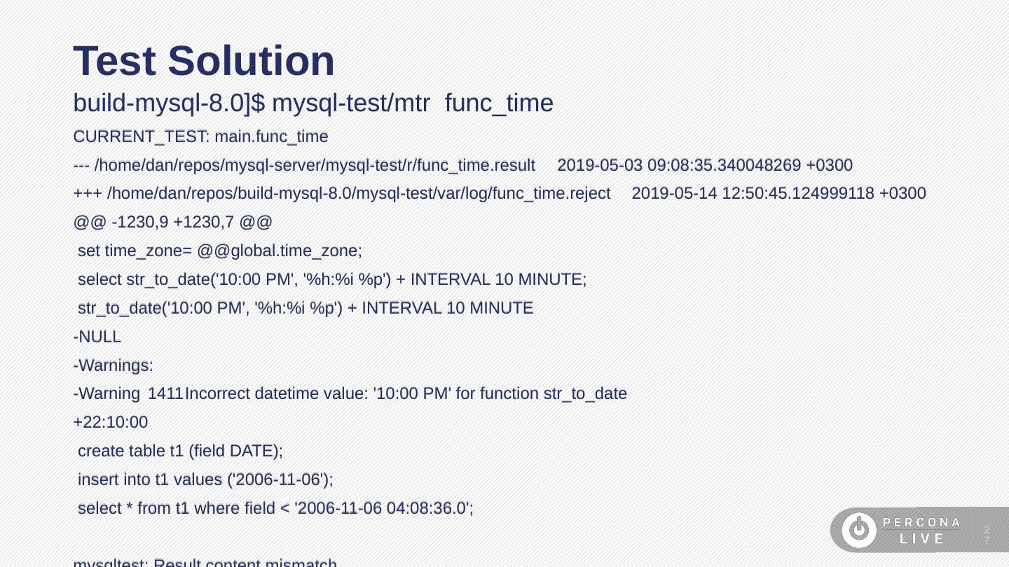 13 .Create a Test Case mysql-server]$ cat mysql-test/t/bug71386.test SELECT STR_TO_DATE('01:35 PM', '%h:%i %p'); build-mysql-8.0]$ mysql-test/mtr bug71386 … ----------- MYSQLTEST OUTPUT START ----------- SELECT STR_TO_DATE('01:35 PM', '%h:%i %p'); STR_TO_DATE('01:35 PM', '%h:%i %p') NULL Warnings: Warning 1411 Incorrect datetime value: '01:35 PM' for function str_to_date 1 3