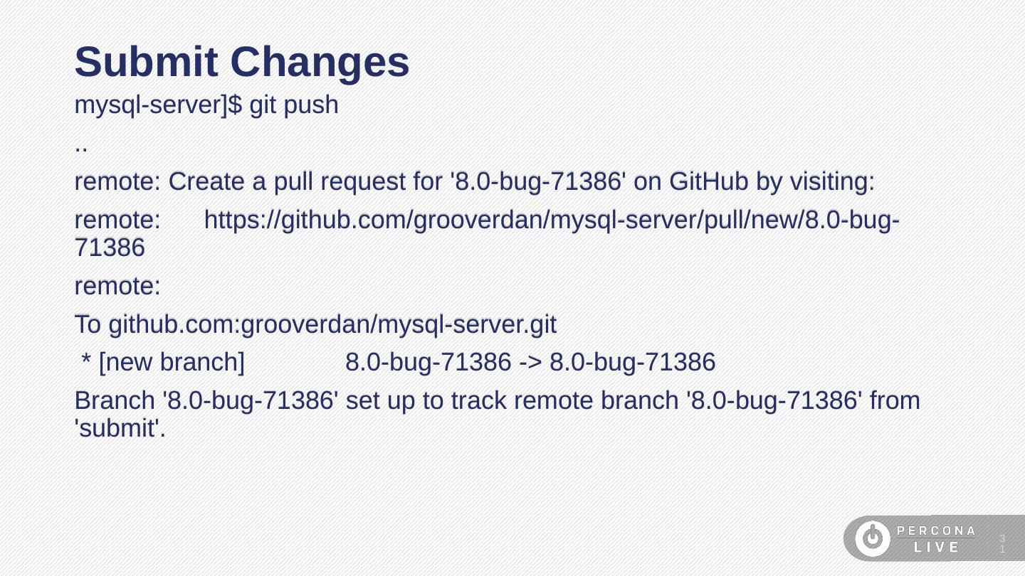 29 .Submit Changes mysql-server]$ git checkout -b 8.0-bug-71386 M mysql-test/r/func_time.result M sql/item_timefunc.cc Switched to a new branch '8.0-bug-71386' 2 9
