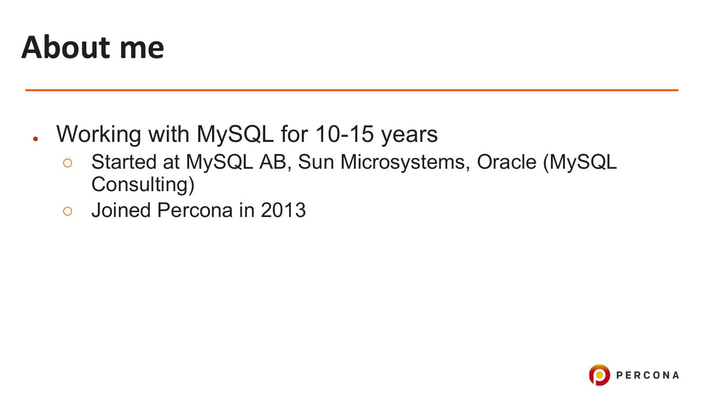2 .About me ● Working with MySQL for 10-15 years ○ Started at MySQL AB, Sun Microsystems, Oracle (MySQL Consulting) ○ Joined Percona in 2013