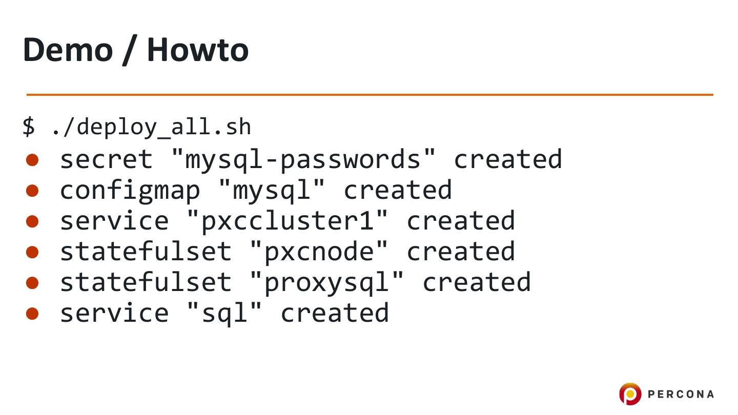12 .Demo / Howto $ ./deploy_all.sh ● secret "mysql-passwords" created ● configmap "mysql" created ● service "pxccluster1" created ● statefulset "pxcnode" created ● statefulset "proxysql" created ● service "sql" created