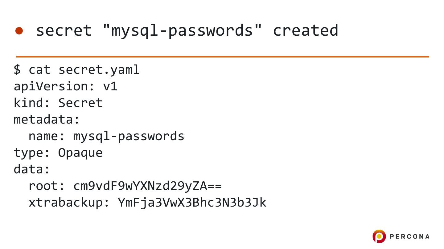 13 .● secret "mysql-passwords" created $ cat secret.yaml apiVersion: v1 kind: Secret metadata: name: mysql-passwords type: Opaque data: root: cm9vdF9wYXNzd29yZA== xtrabackup: YmFja3VwX3Bhc3N3b3Jk