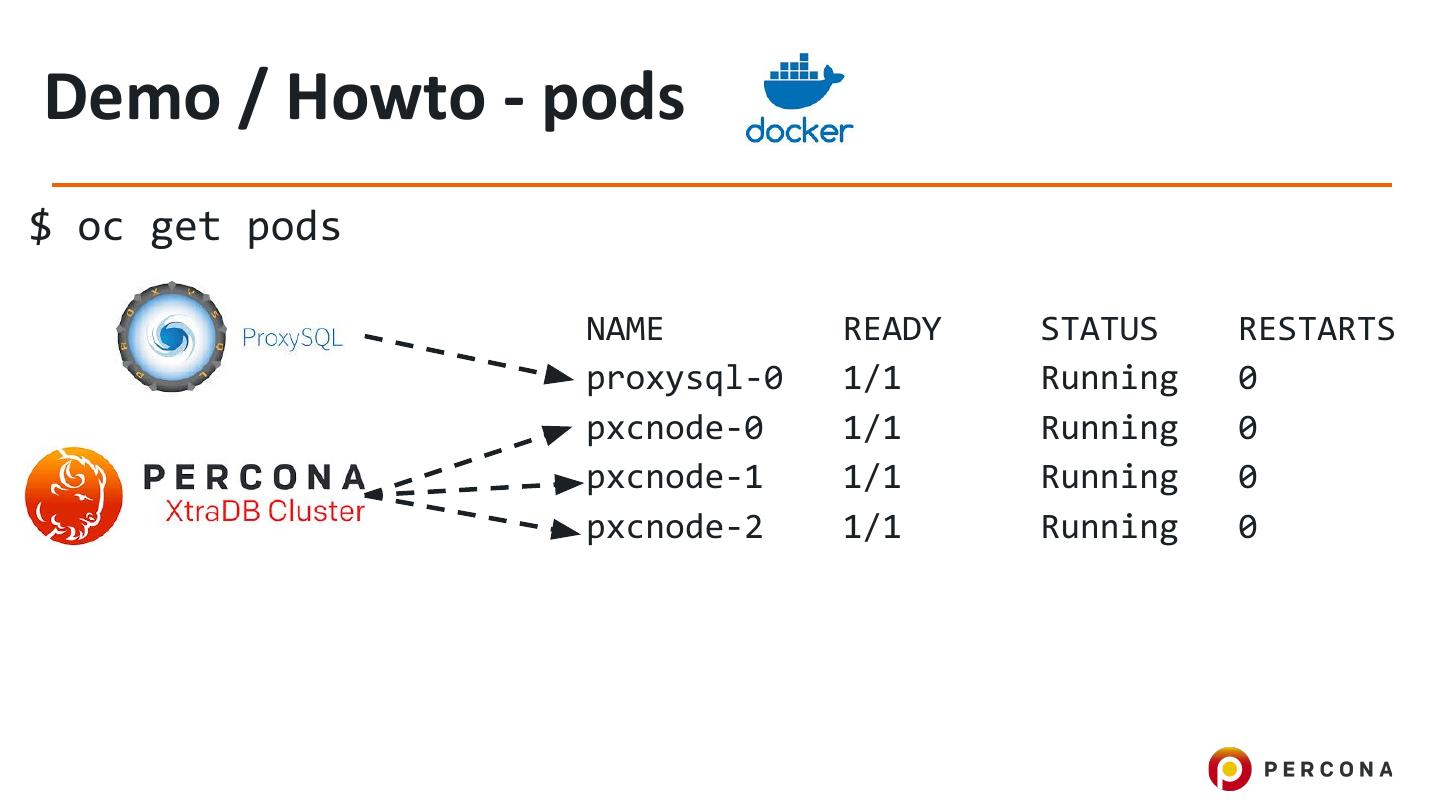 19 .Demo / Howto - pods $ oc get pods NAME READY STATUS RESTARTS proxysql-0 1/1 Running 0 pxcnode-0 1/1 Running 0 pxcnode-1 1/1 Running 0 pxcnode-2 1/1 Running 0