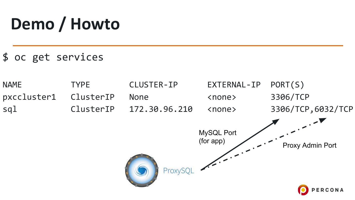 20 . Demo / Howto $ oc get services NAME TYPE CLUSTER-IP EXTERNAL-IP PORT(S) pxccluster1 ClusterIP None <none> 3306/TCP sql ClusterIP 172.30.96.210 <none> 3306/TCP,6032/TCP MySQL Port (for app) Proxy Admin Port