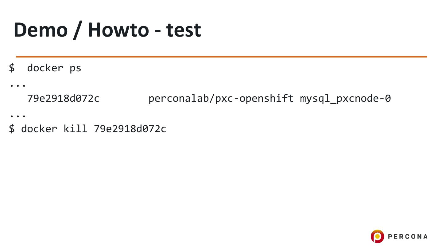 24 .Demo / Howto - test $ docker ps ... 79e2918d072c perconalab/pxc-openshift mysql_pxcnode-0 ... $ docker kill 79e2918d072c