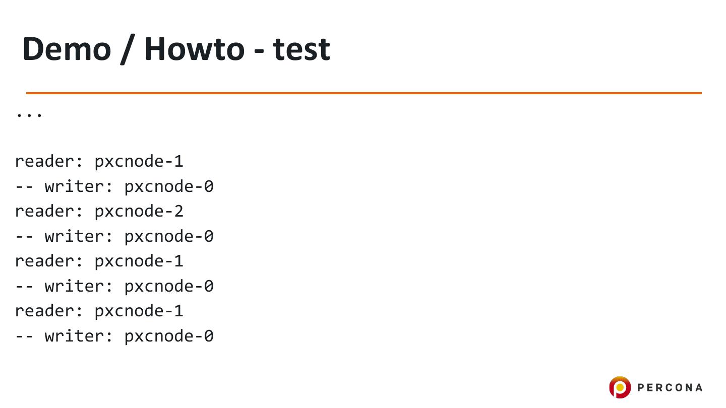 23 .Demo / Howto - test $ for i in {1..600}; do mysql -h `oc get svc/sql -o=yaml|grep clusterIP|cut -d':' -f 2` -s -Nbe 'select concat("reader: ", @@hostname); select concat("-- writer: ", @@hostname) for update'; sleep 1; done reader: pxcnode-1 -- writer: pxcnode-0 reader: pxcnode-2 -- writer: pxcnode-0 reader: pxcnode-1 -- writer: pxcnode-0 reader: pxcnode-1 -- writer: pxcnode-0