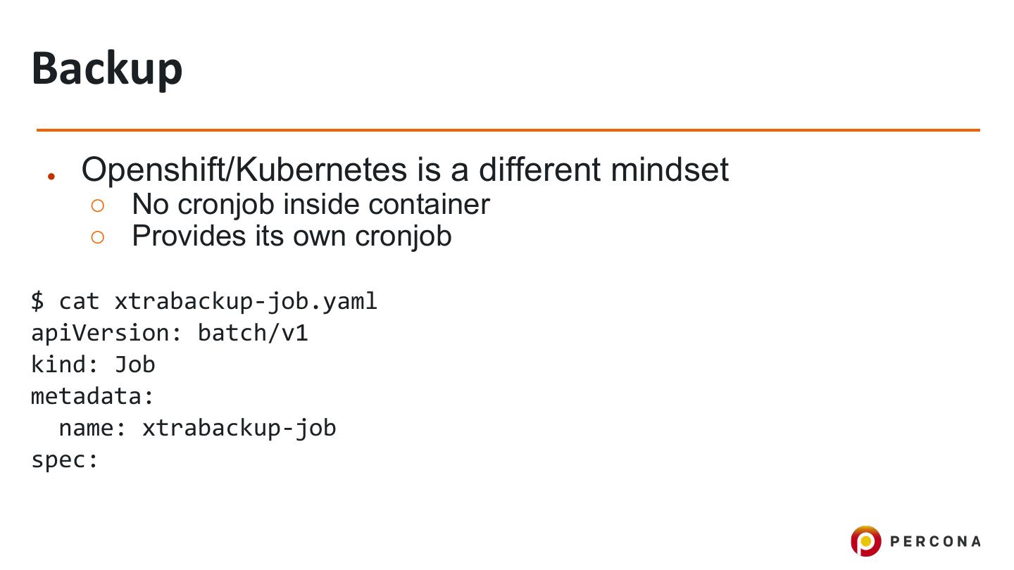 27 .Backup ● Openshift/Kubernetes is a different mindset ○ No cronjob inside container ○ Provides its own cronjob $ cat xtrabackup-job.yaml apiVersion: batch/v1 kind: Job metadata: name: xtrabackup-job spec: