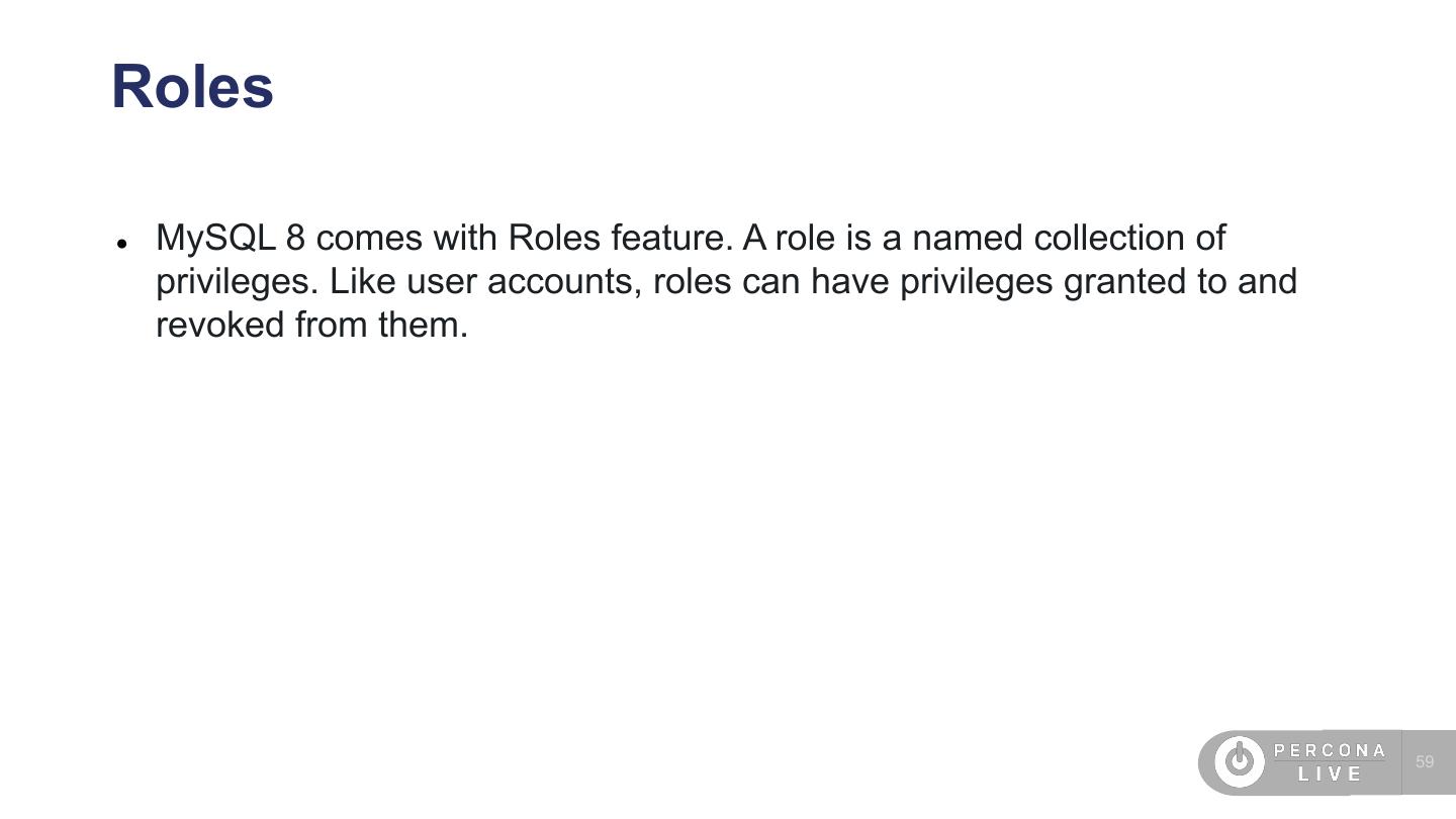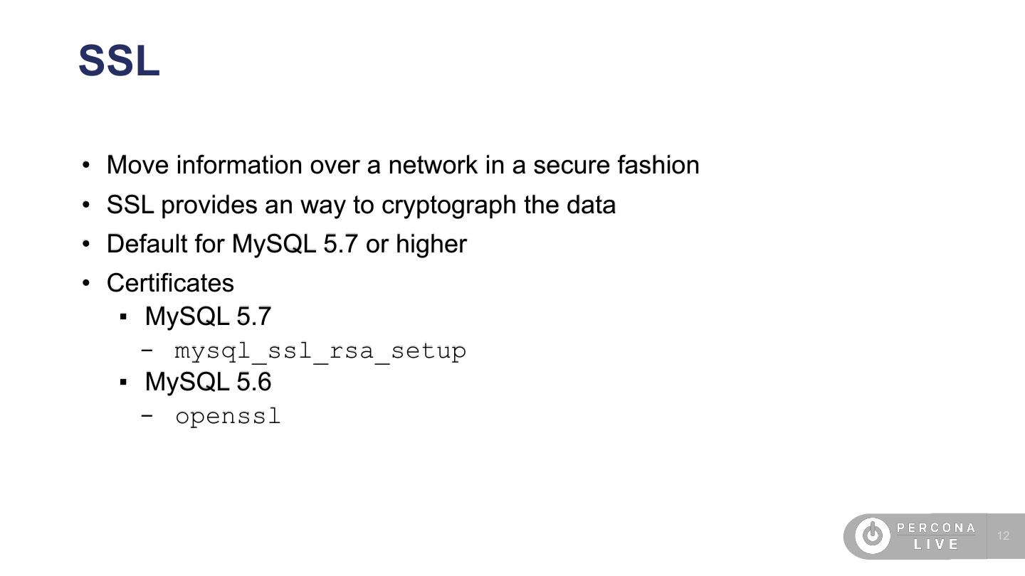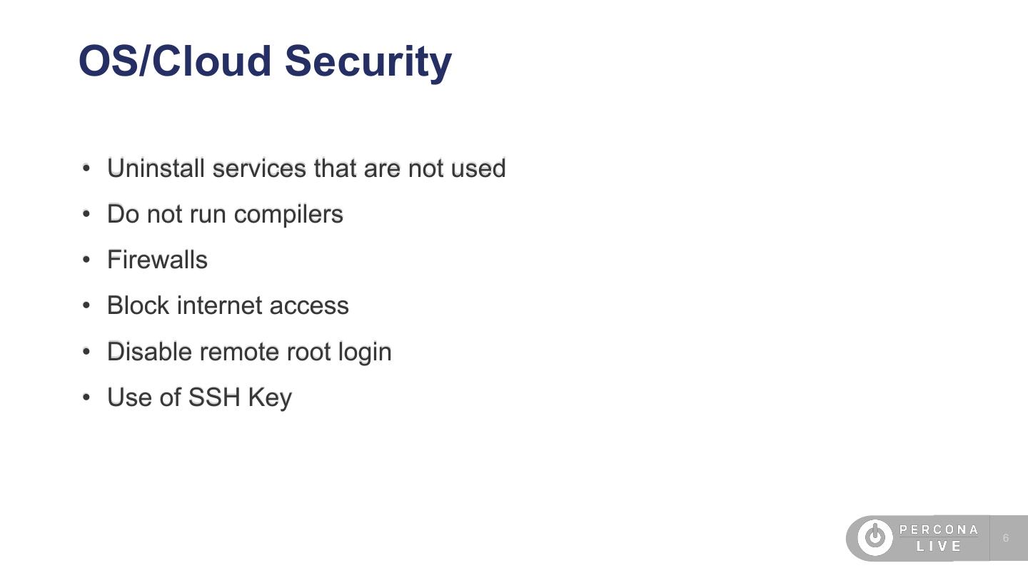 4 .Agenda • SO/Cloud security • SSL • Password management • Audit plugin • Percona Server encryption features • MySQL 8 features (undo, redo encryption) • TDE • New caching_sha2_password • FIPS mode • Roles 4