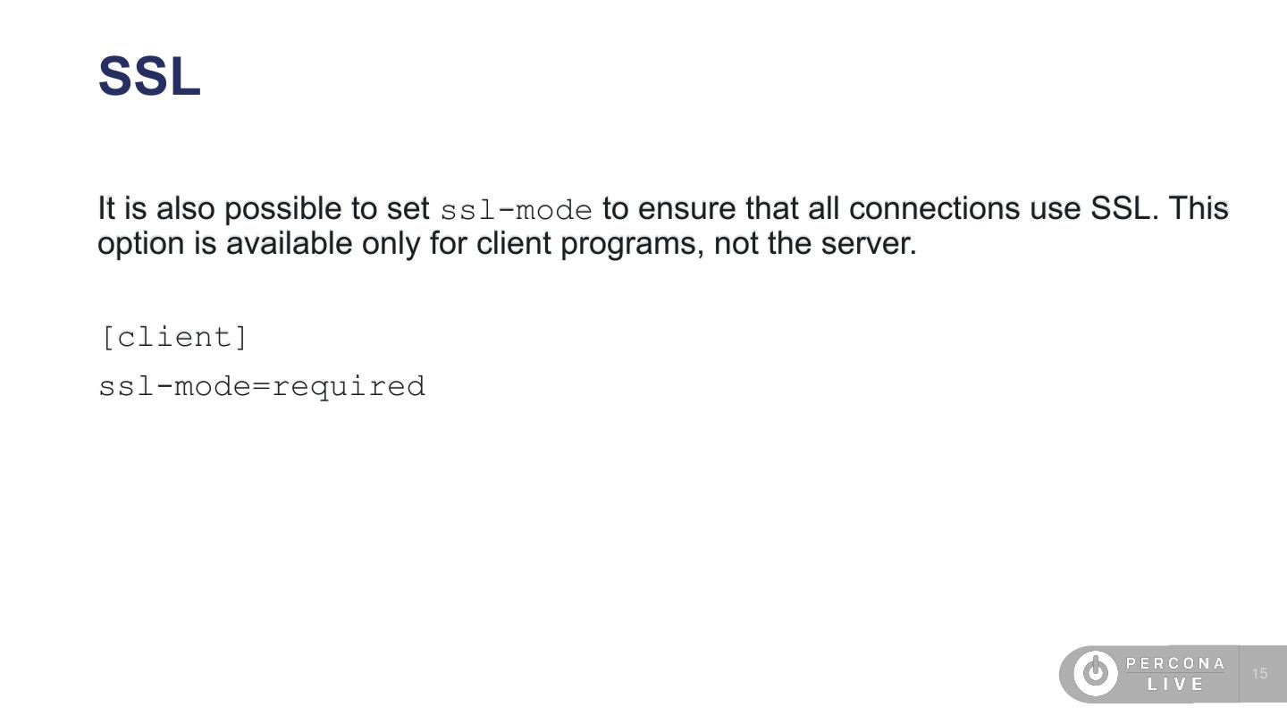 15 .SSL It is also possible to set ssl-mode to ensure that all connections use SSL. This option is available only for client programs, not the server. [client] ssl-mode=required 15