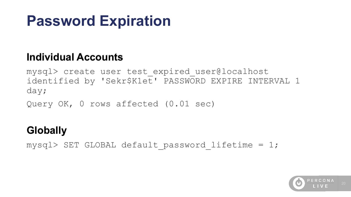 20 .Password Expiration Individual Accounts mysql> create user test_expired_user@localhost identified by 'Sekr$K1et' PASSWORD EXPIRE INTERVAL 1 day; Query OK, 0 rows affected (0.01 sec) Globally mysql> SET GLOBAL default_password_lifetime = 1; 20