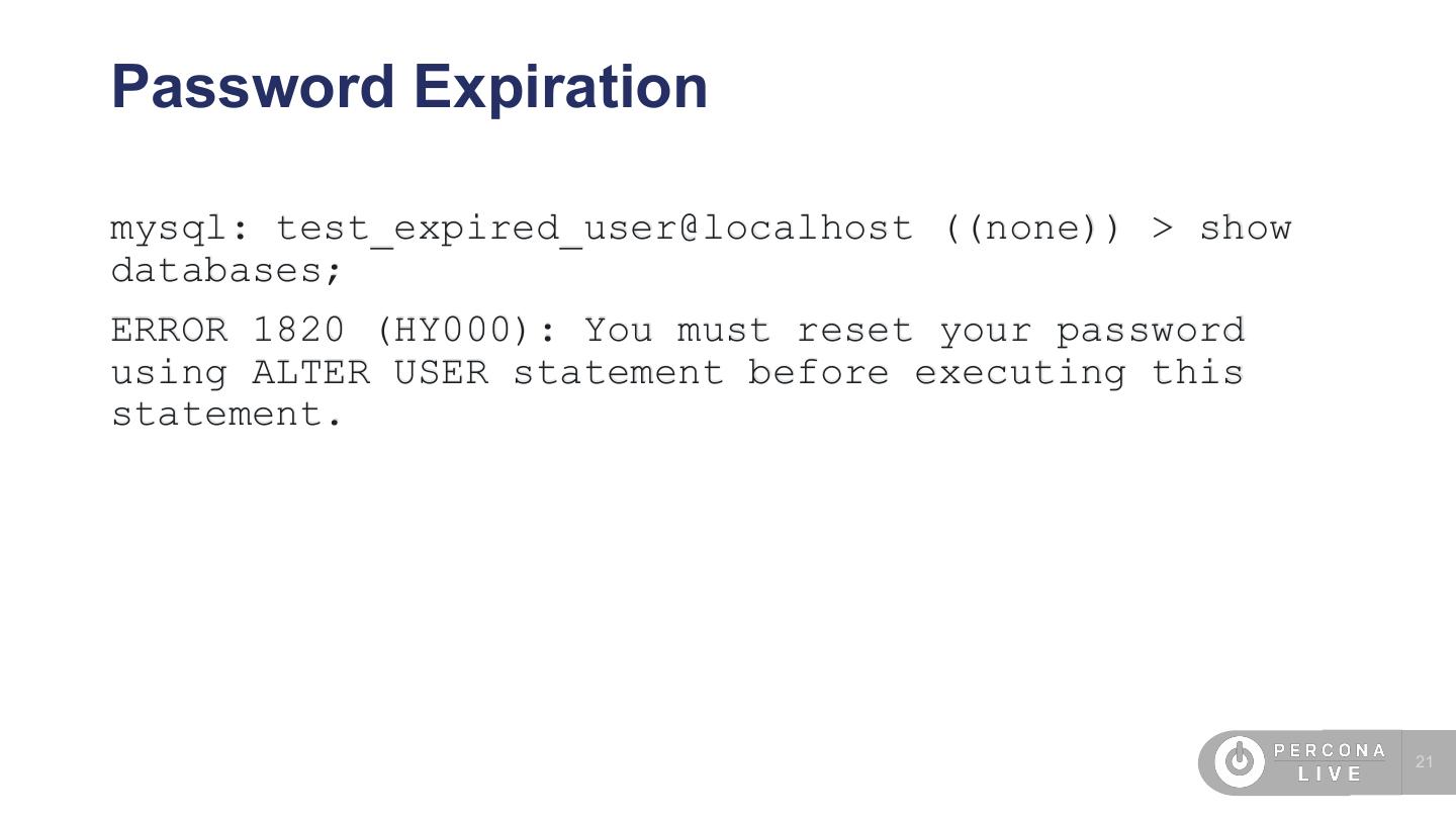 21 .Password Expiration mysql: test_expired_user@localhost ((none)) > show databases; ERROR 1820 (HY000): You must reset your password using ALTER USER statement before executing this statement. 21