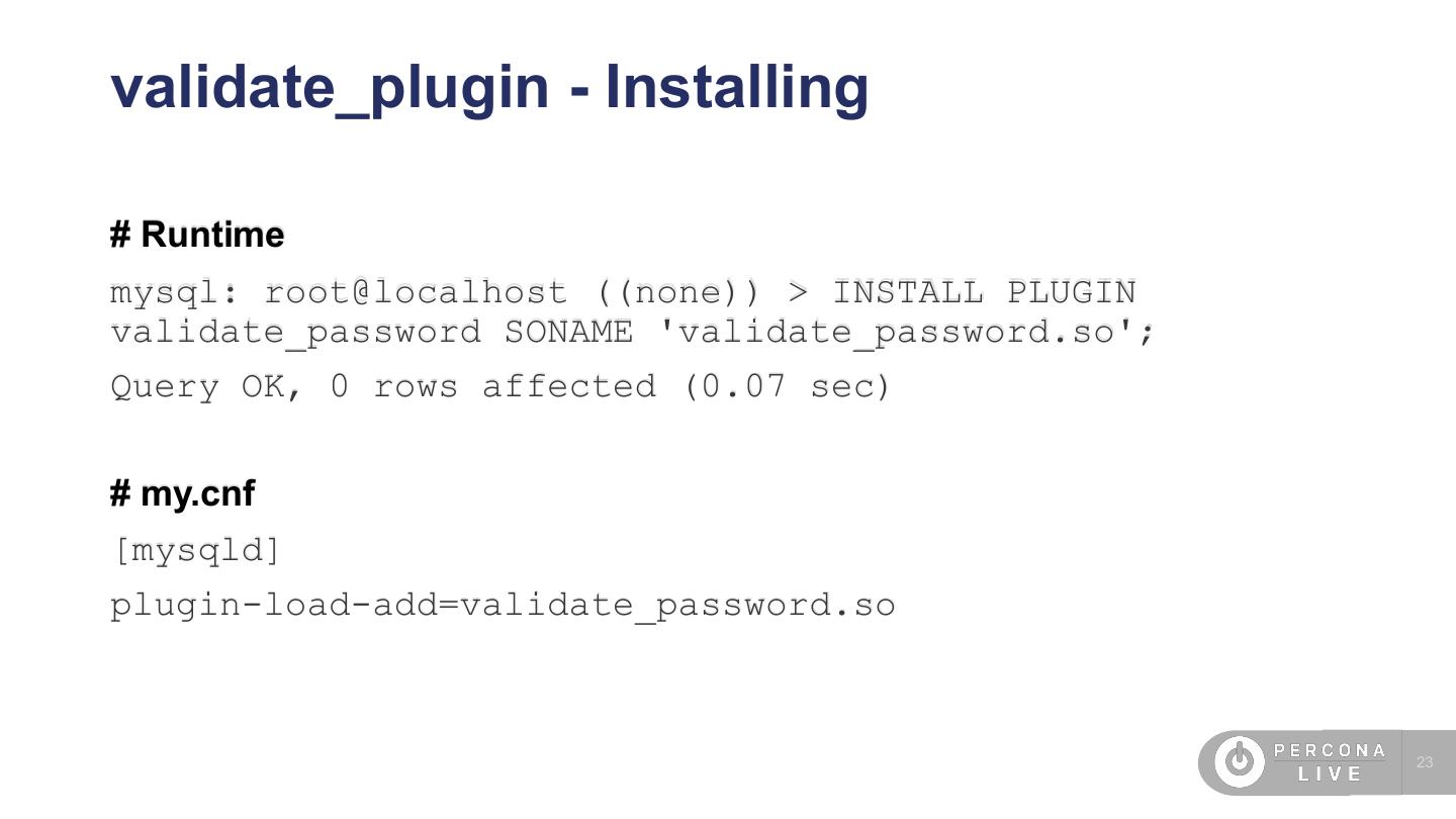 23 .validate_plugin - Installing # Runtime mysql: root@localhost ((none)) > INSTALL PLUGIN validate_password SONAME 'validate_password.so'; Query OK, 0 rows affected (0.07 sec) # my.cnf [mysqld] plugin-load-add=validate_password.so 23