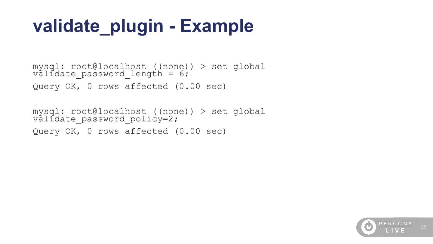 25 .validate_plugin - Example mysql: root@localhost ((none)) > set global validate_password_length = 6; Query OK, 0 rows affected (0.00 sec) mysql: root@localhost ((none)) > set global validate_password_policy=2; Query OK, 0 rows affected (0.00 sec) 25